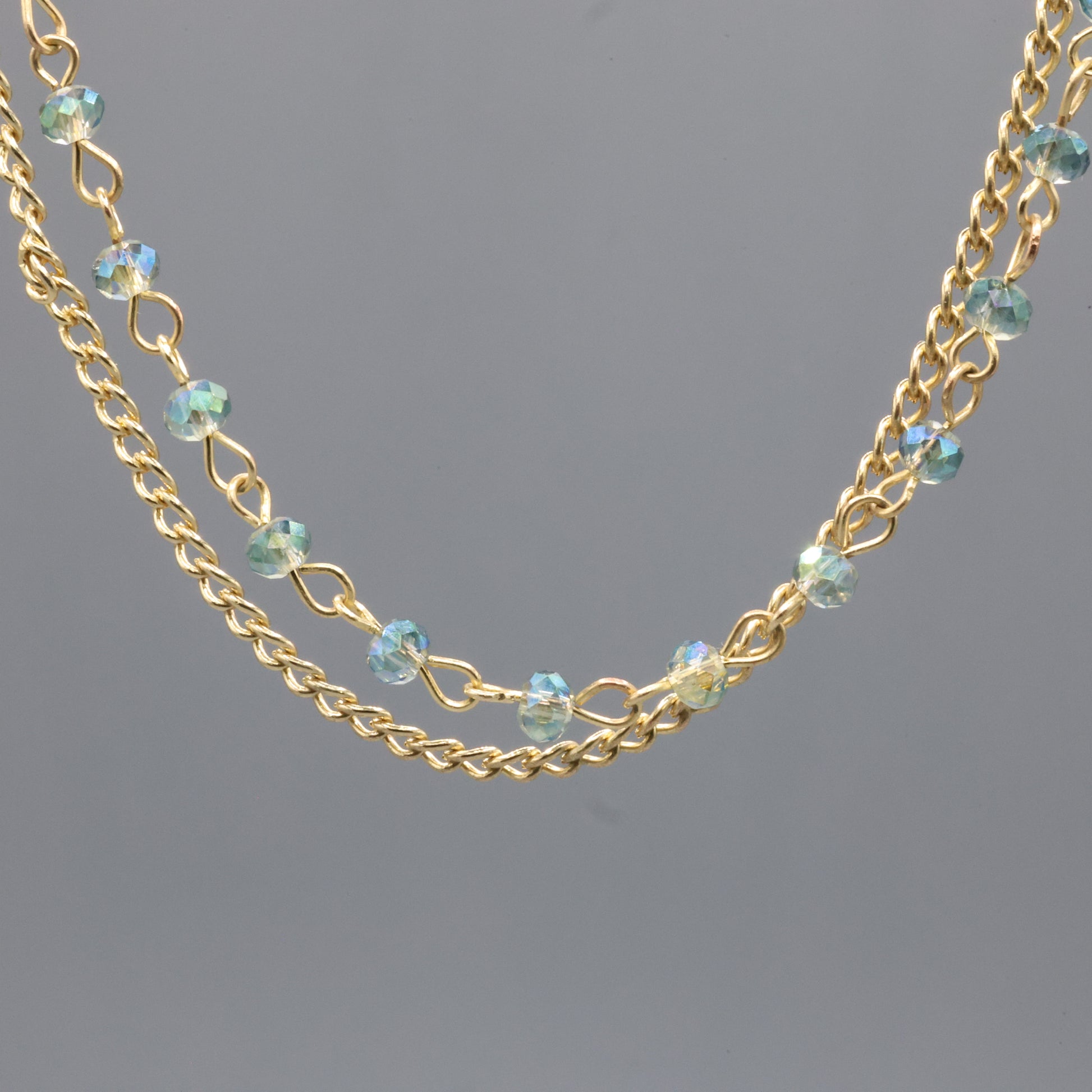 A whisper of light and motion, featuring two delicate layers of gold-tone chain, accented with faceted blue beads that catch the light like droplets on sunlit glass. The 22-inch length offers graceful drape and effortless styling—perfect alone or layered with longer strands. Simple yet luminous, this necklace evokes clarity, calm, and the quiet beauty of a well-chosen detail.