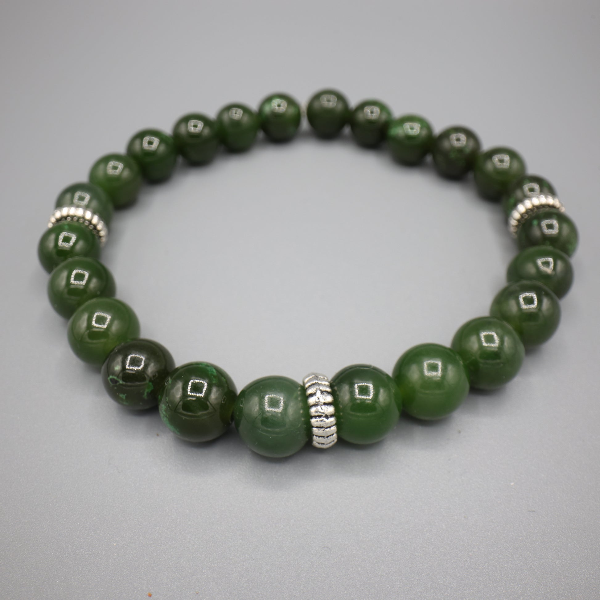 A whisper of calm in a world of motion. This bracelet features polished green jade beads, each one radiating gentle strength and natural harmony. Three silver-tone spacers add a touch of refined contrast. Hand-strung for comfort and intention, this piece invites balance, clarity, and quiet elegance into your everyday ritual.