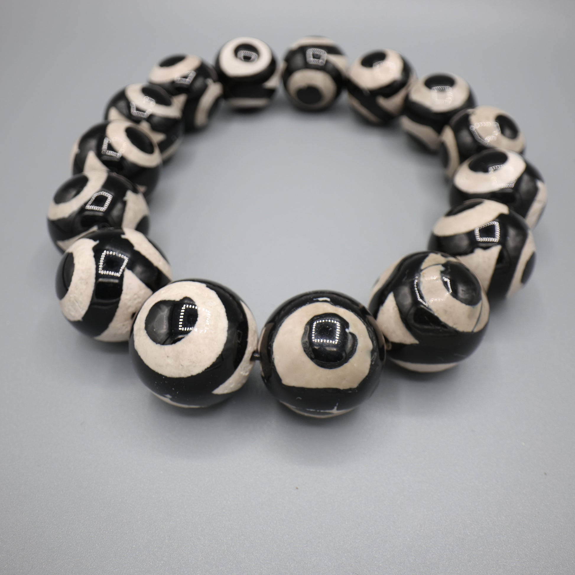 A bold talisman for modern protection. This bracelet features 12mm glass beads adorned with the iconic evil eye symbol—an ancient emblem believed to ward off negativity and attract clarity. Glossy and graphic, each bead is a watchful charm, strung together to create a piece that’s as stylish as it is symbolic. Wear it solo or stack it to keep your energy guarded and your look striking.
