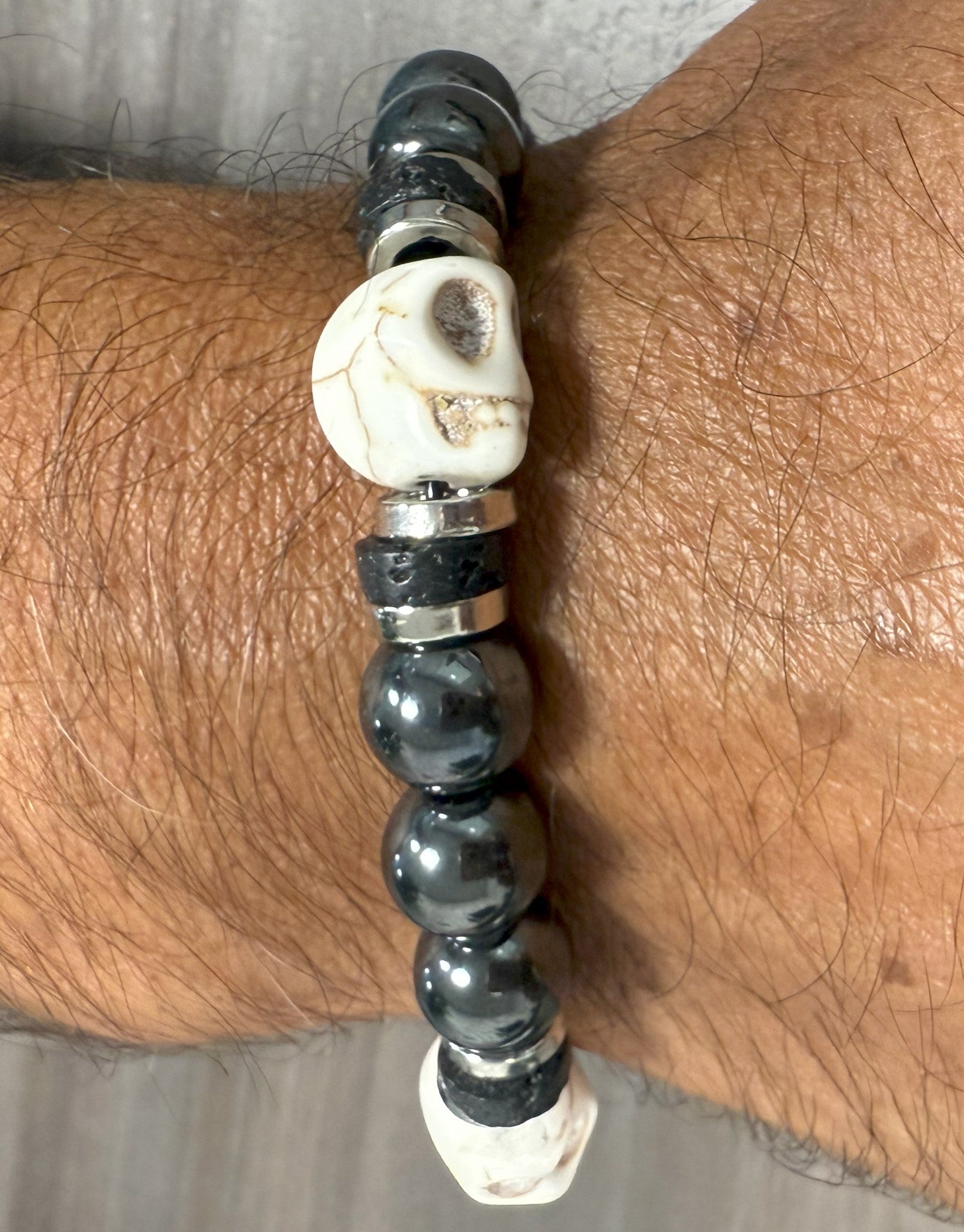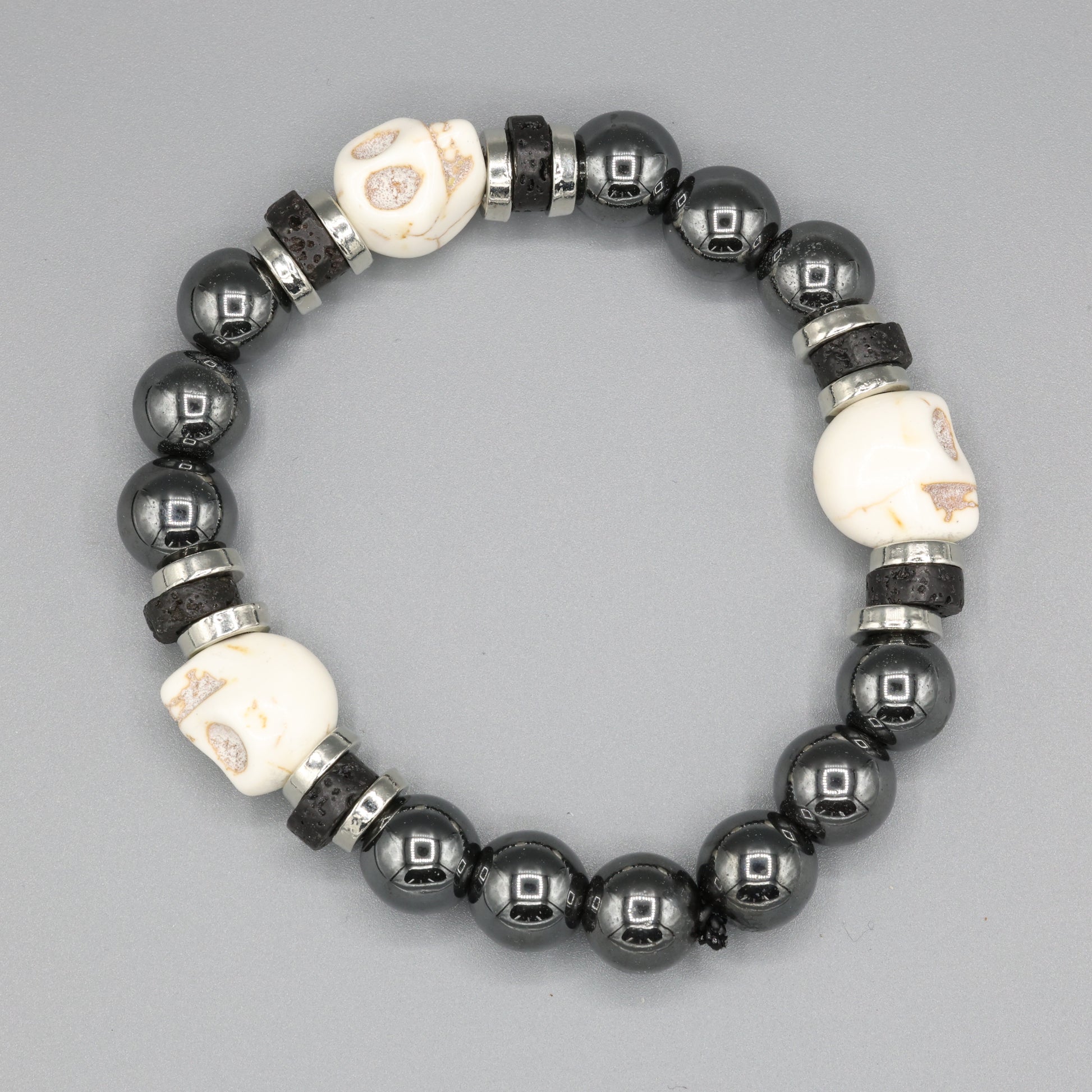 Strength meets symbolism. Crafted with sleek hematite stones known for their grounding and protective energy, this piece is anchored by three carved howlite skulls—symbols of transformation, wisdom, and spiritual clarity. The contrast of dark shine and bone-white detail creates a striking balance of edge and intention.