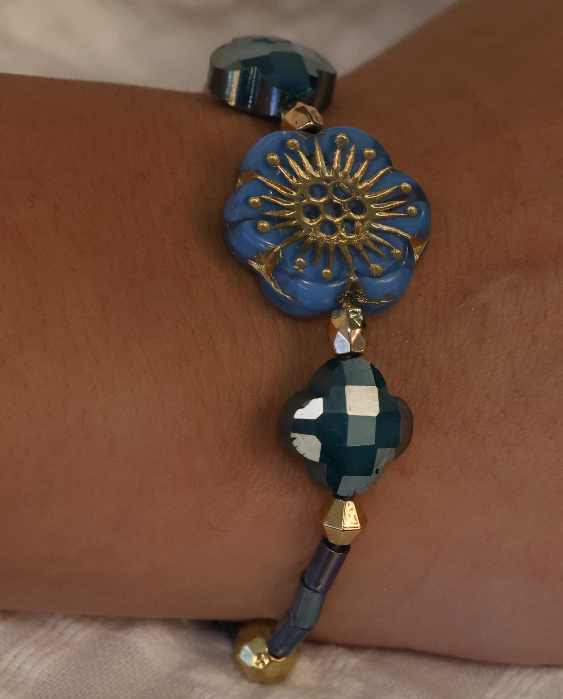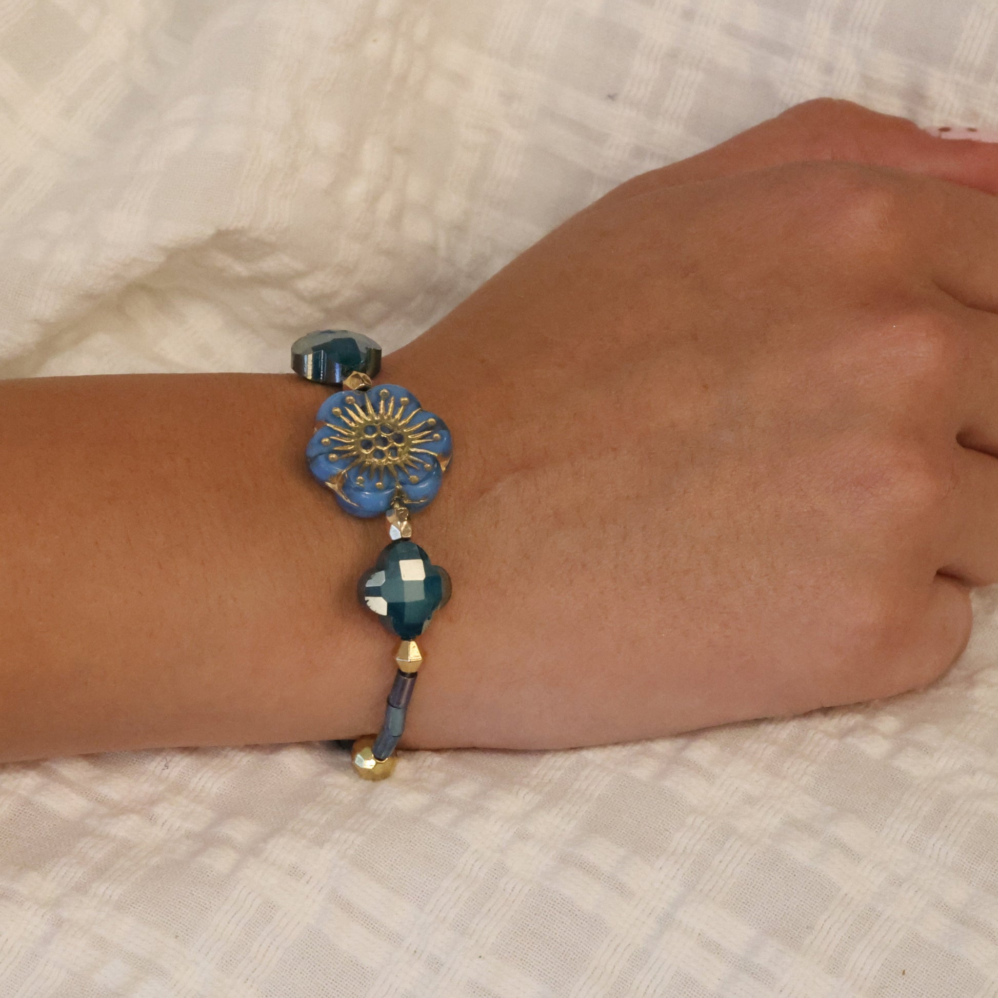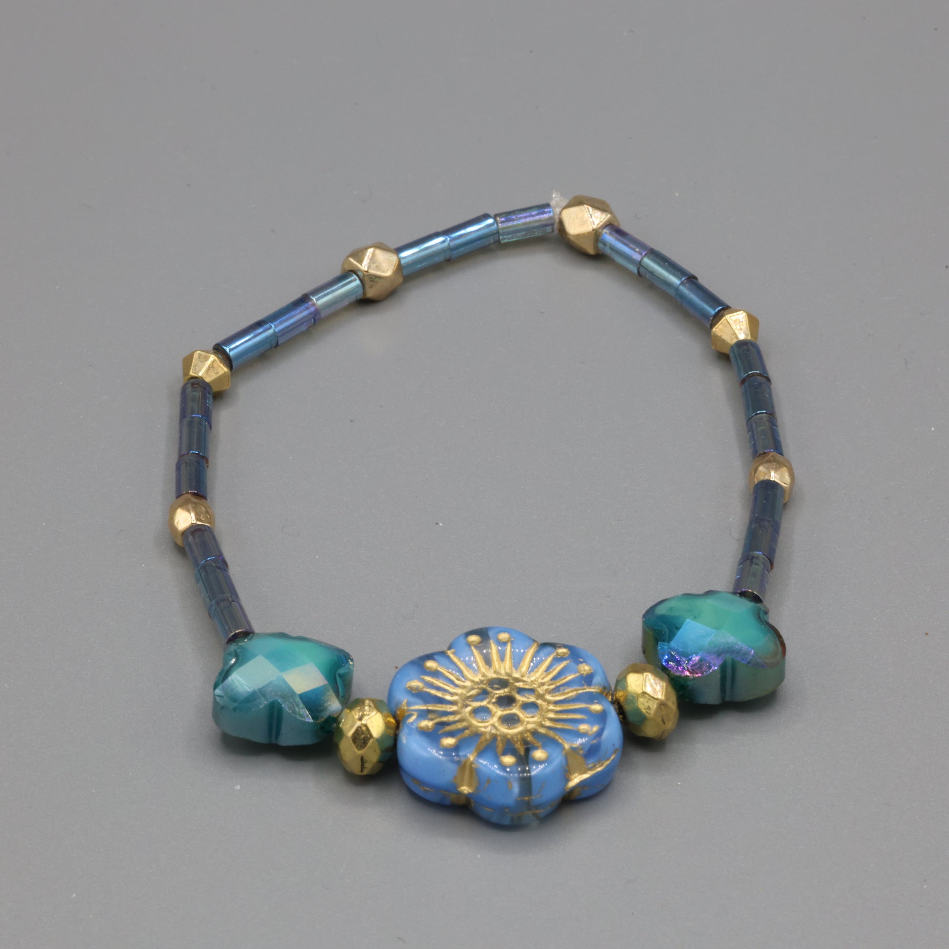A delicate circle of harmony and light, this handcrafted bracelet features Czech glass beads in serene shades of turquoise and cobalt. At its heart blooms a blue flower-shaped focal bead, kissed with gold detailing — a symbol of growth and grace. Flanking the center are faceted turquoise glass beads, followed by cylindrical blue accents and gold-toned spacers that lend warmth and balance. The symmetrical design evokes a sense of calm and intentionality.
