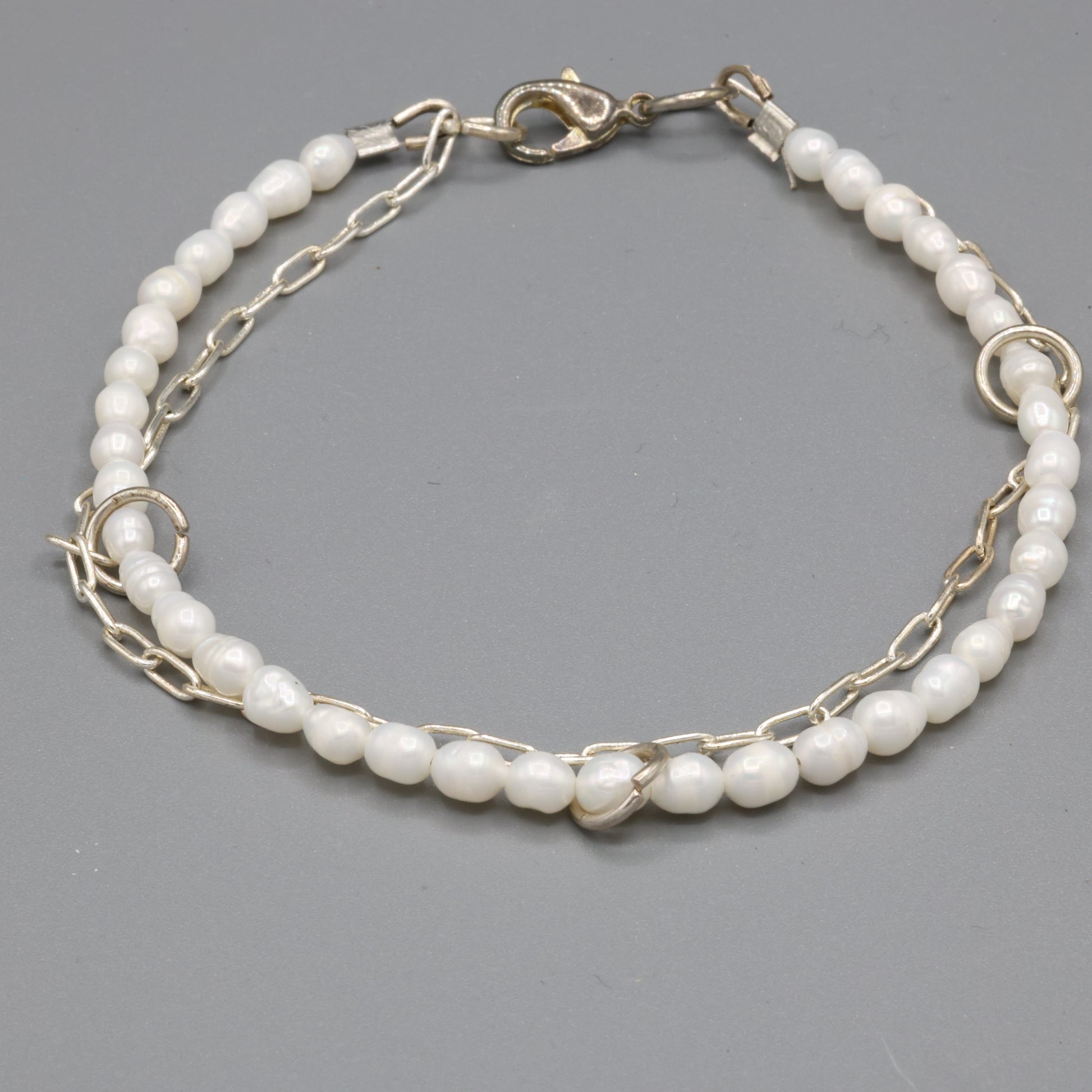 A timeless silhouette reimagined with contemporary flair, this handmade bracelet features a strand of luminous faux pearls paired with a delicate silver-plated chain that drapes like moonlight. The dual-layer design creates a subtle interplay of texture and movement — a nod to both vintage romance and modern minimalism. Finished with a secure lobster clasp and polished metal rings, this piece is perfect for layering or wearing solo as a statement of quiet sophistication. Elegant, versatile, and effortlessly radiant.