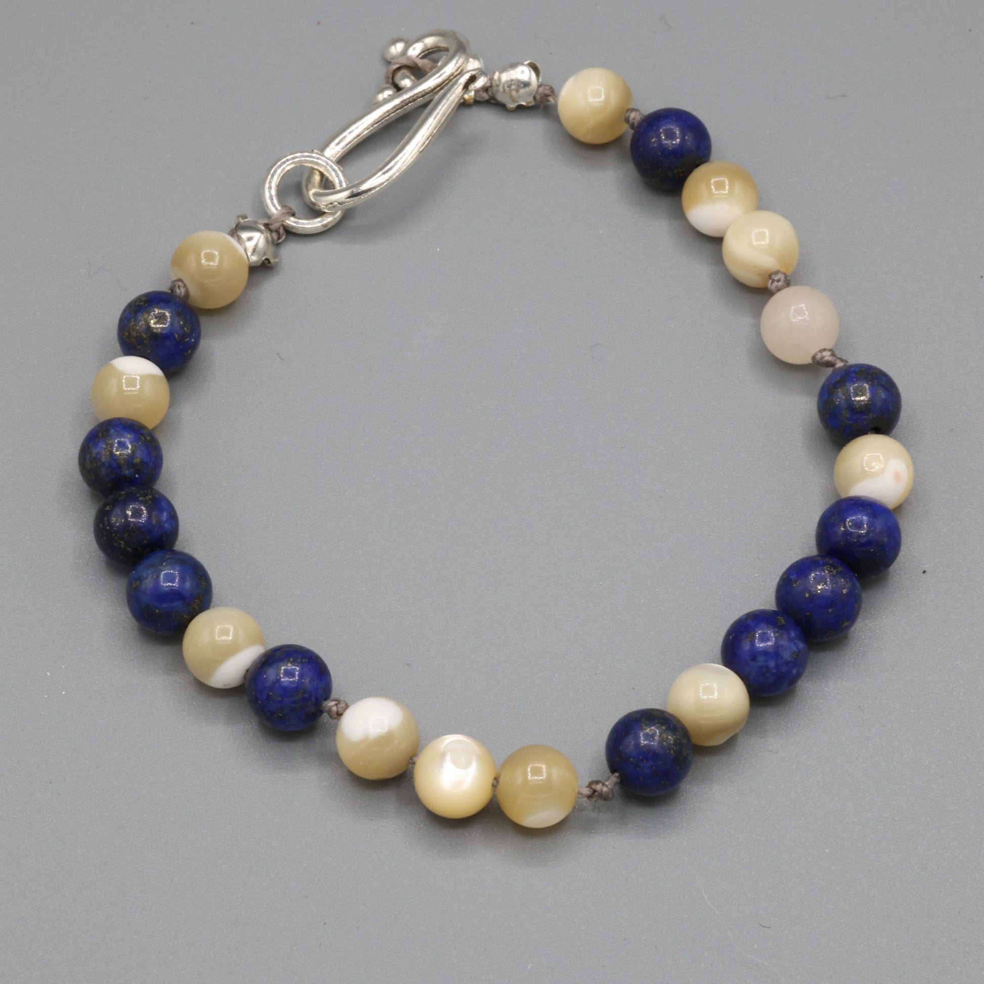This handmade bracelet features 6mm tan-hued mother-of-pearl beads, each one glowing with a gentle, organic luster. Dark blue beads anchor the design, adding contrast, intention, and a touch of mystery. Mother of pearl is known for its calming energy and connection to intuition, while the blue accent invites depth and clarity.
