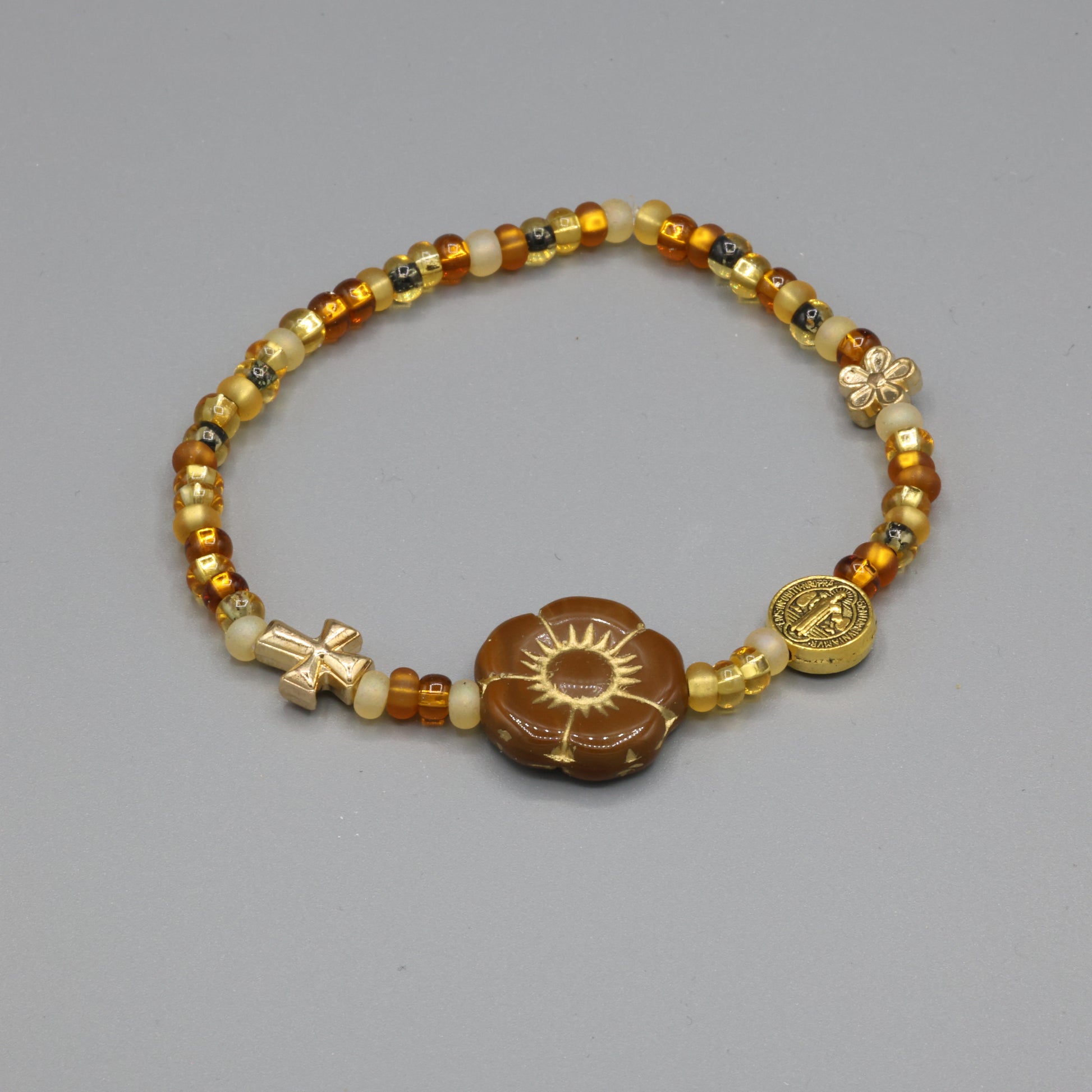 A radiant expression of love and faith, this bracelet is a handcrafted bracelet that blossoms with meaning. Czech seed beads in warm amber, cream, and gold tones form a delicate strand, accented by a heart-shaped Czech glass centerpiece—symbolizing compassion and emotional clarity. A gold-tone cross and a St. Benedict medal lend sacred protection and spiritual grounding. Wear it as a gentle reminder of inner strength, divine connection, and the beauty of blooming devotion.
