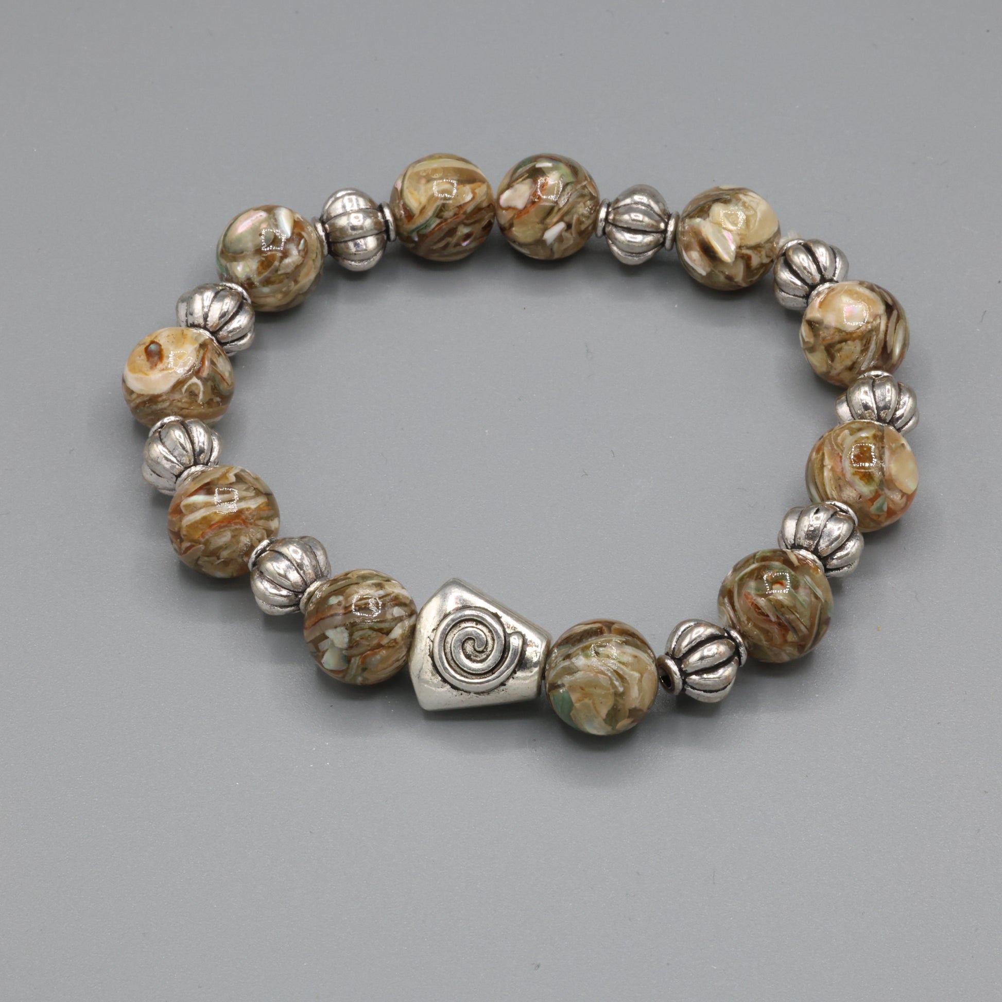This handcrafted bracelet speaks in soft tones of earth and light. Featuring marbled agate beads with natural swirls of beige, brown, and moss, each stone carries its own quiet story. Silver-plated accents add a touch of shimmer and structure, while a spiral-engraved focal bead draws the eye inward—symbolizing growth, intuition, and the journey within. A perfect piece for grounding your energy while embracing subtle elegance.
