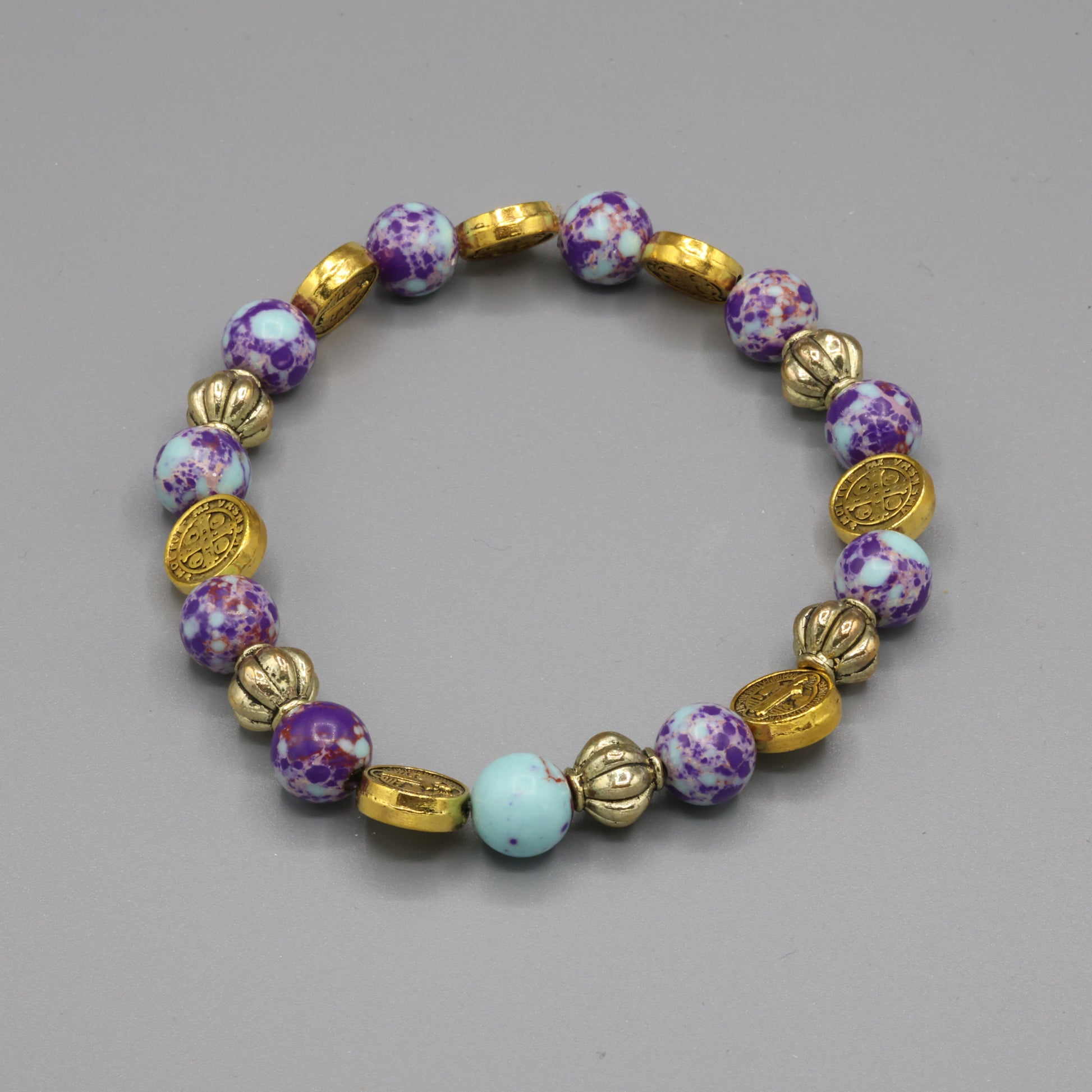 Handcrafted bracelet that flows with color, spirit, and serenity. Featuring 8mm multicolor sea sediment beads—each one a miniature landscape of blues, purples, and earthy tones—this piece carries the essence of ocean tides and sacred ground. Gold-tone St. Benedict medals offer a touch of divine protection and spiritual strength, making this bracelet a visual treasure.
