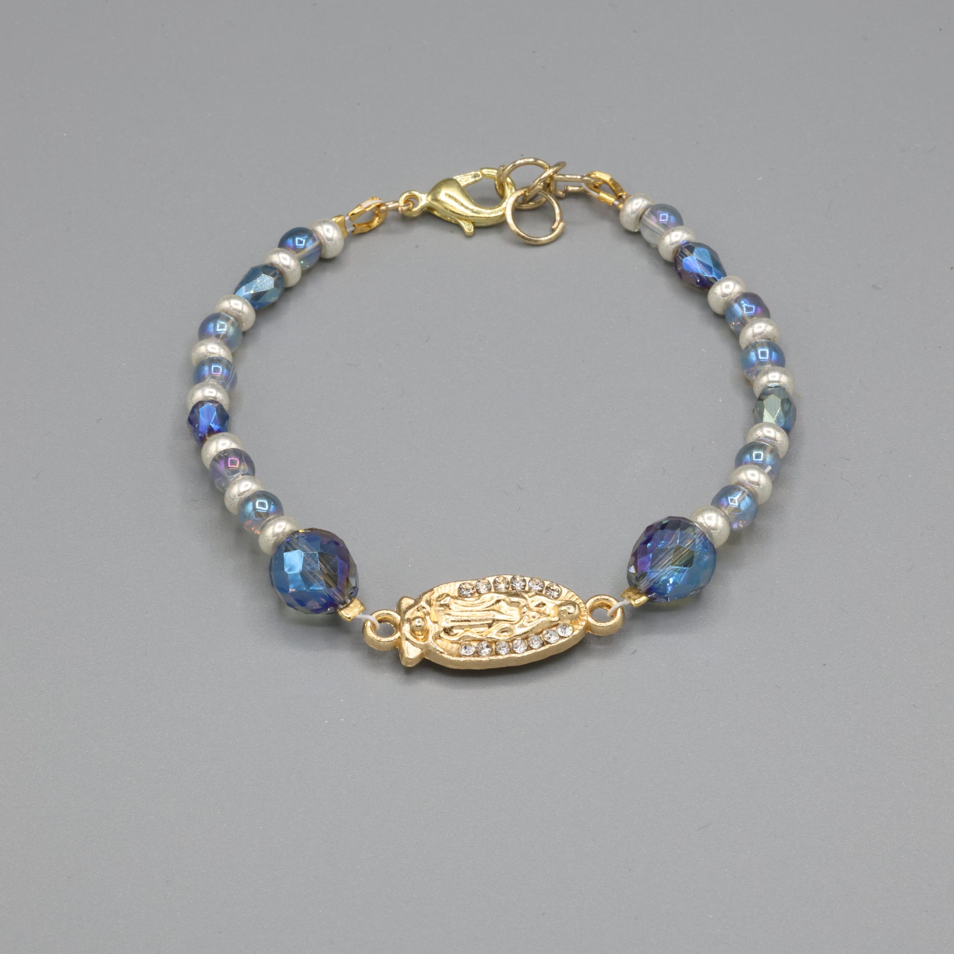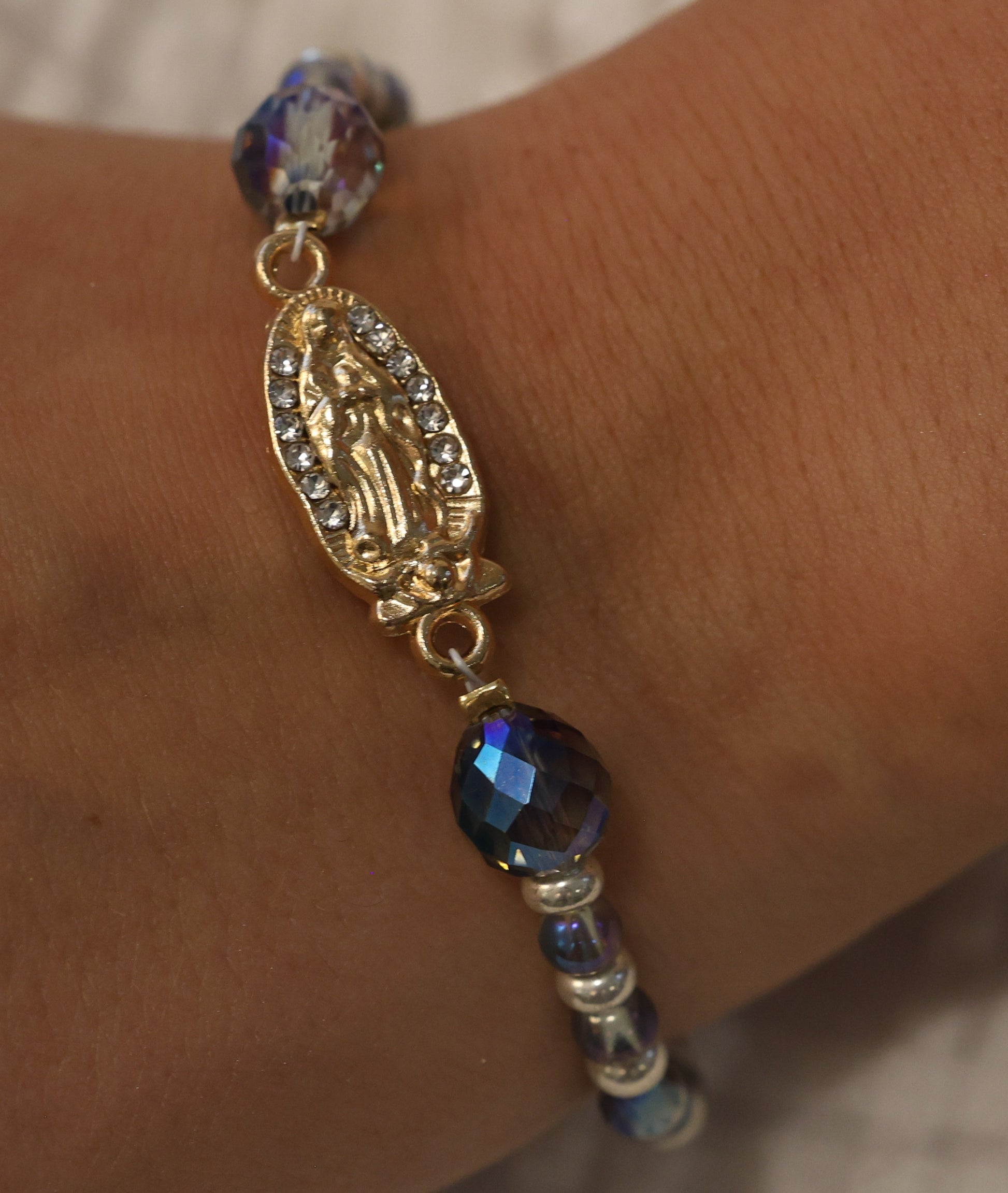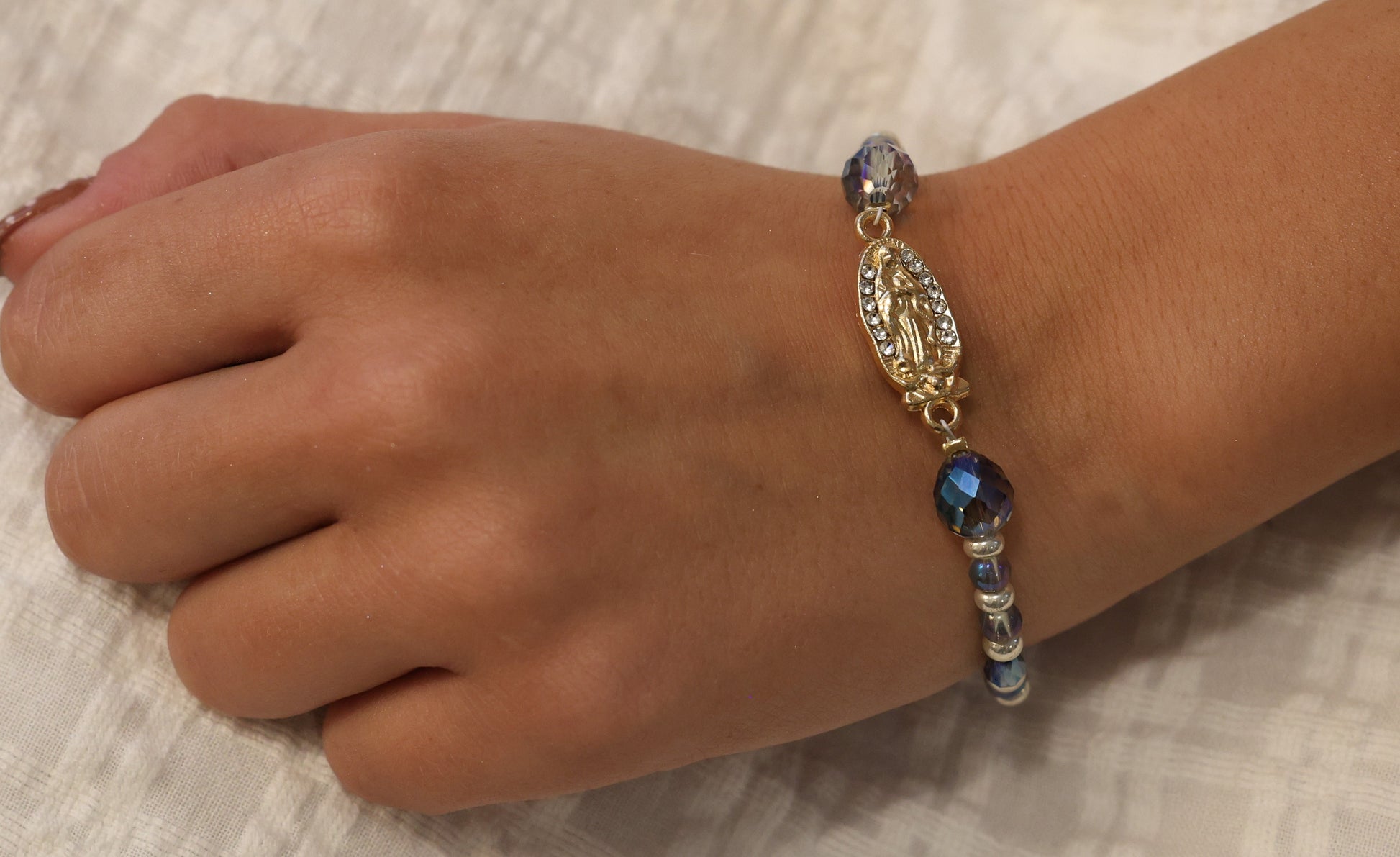 Handcrafted bracelet woven with Czech seed beads and faceted accents that shimmer with quiet light. At its heart rests a gold-tone Mary medal, a symbol of compassion, protection, and divine love. Finished in warm golden tones, this piece is both a spiritual keepsake and a graceful adornment—perfect for moments of reflection, gifting, or everyday devotion.