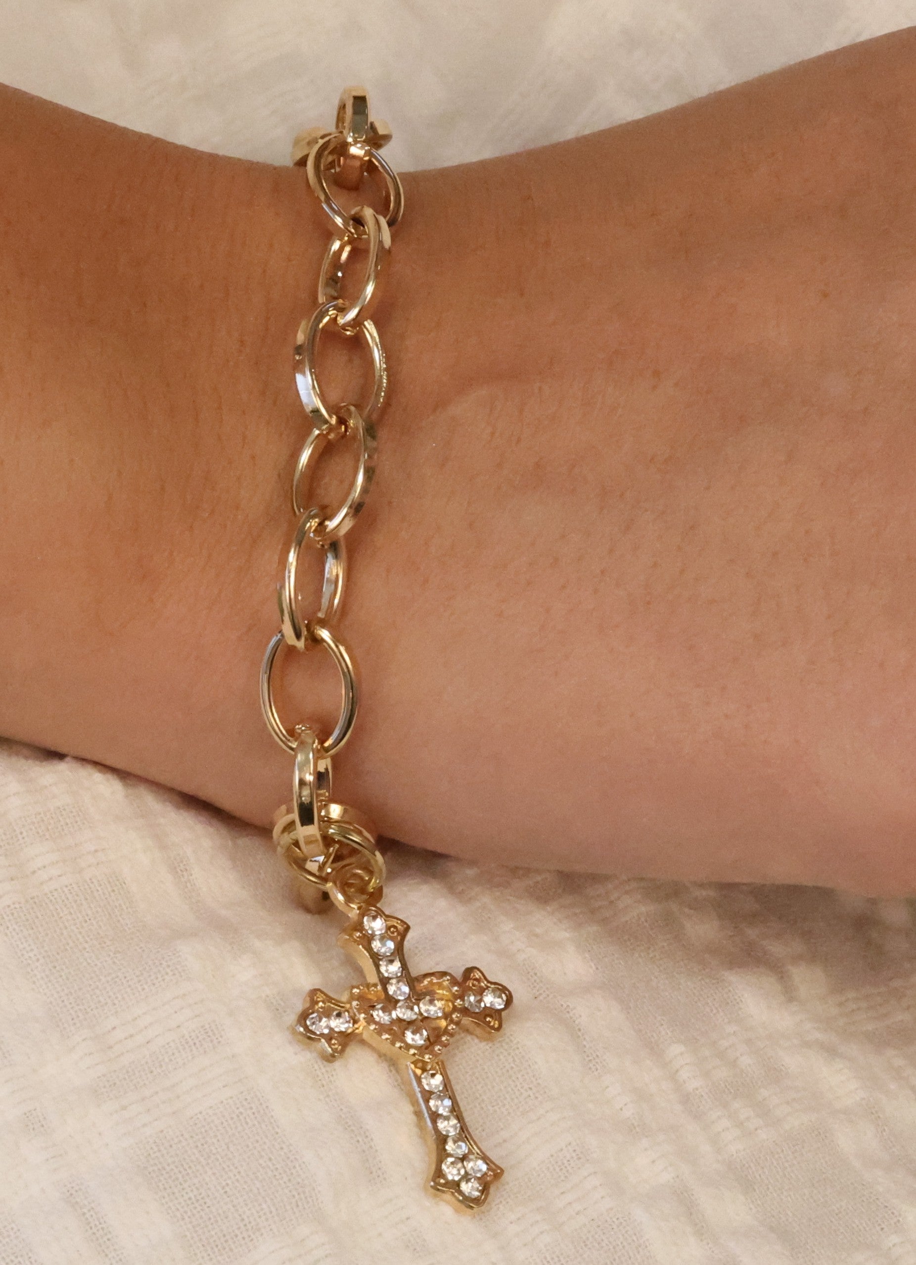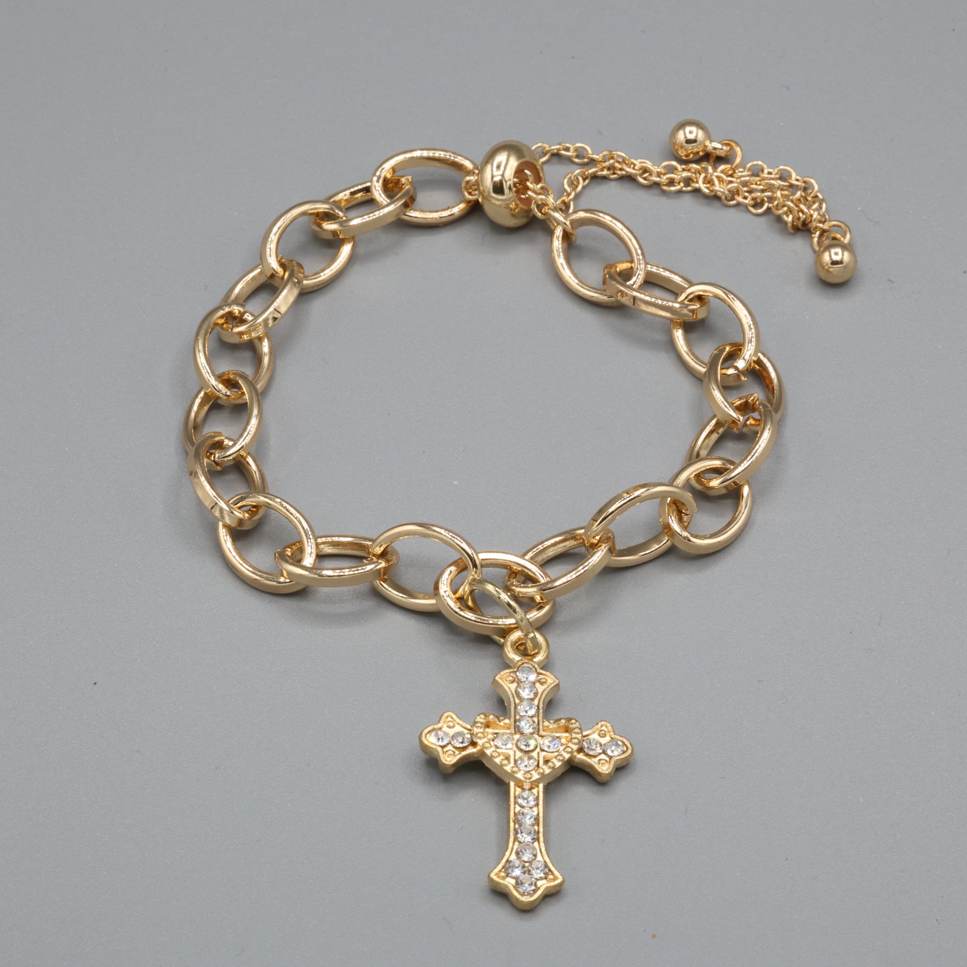 Handcrafted bracelet featuring a gleaming gold-tone chain and a crystal-studded cross charm. Designed to be both a fashion statement and a symbol of faith, this piece carries light, strength, and timeless grace in every link.