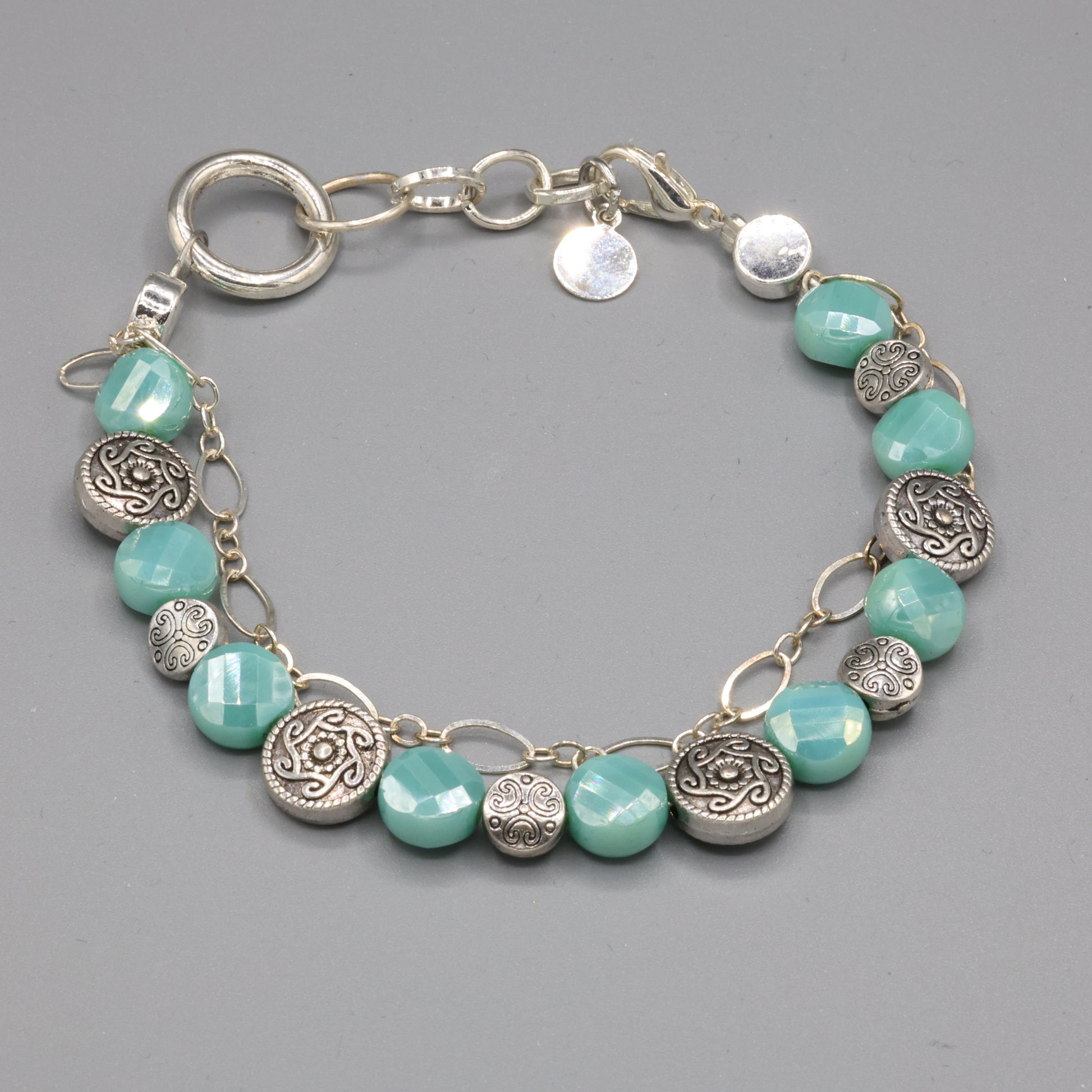 A bracelet of quiet strength and natural clarity. Cool teal beads offer a sense of calm and renewal, while engraved silver-toned charms echo ancient symbols of protection and continuity. Finished with subtle metalwork and thoughtful detailing, it’s a piece for those who walk with grace, guided by intuition and rooted in purpose.