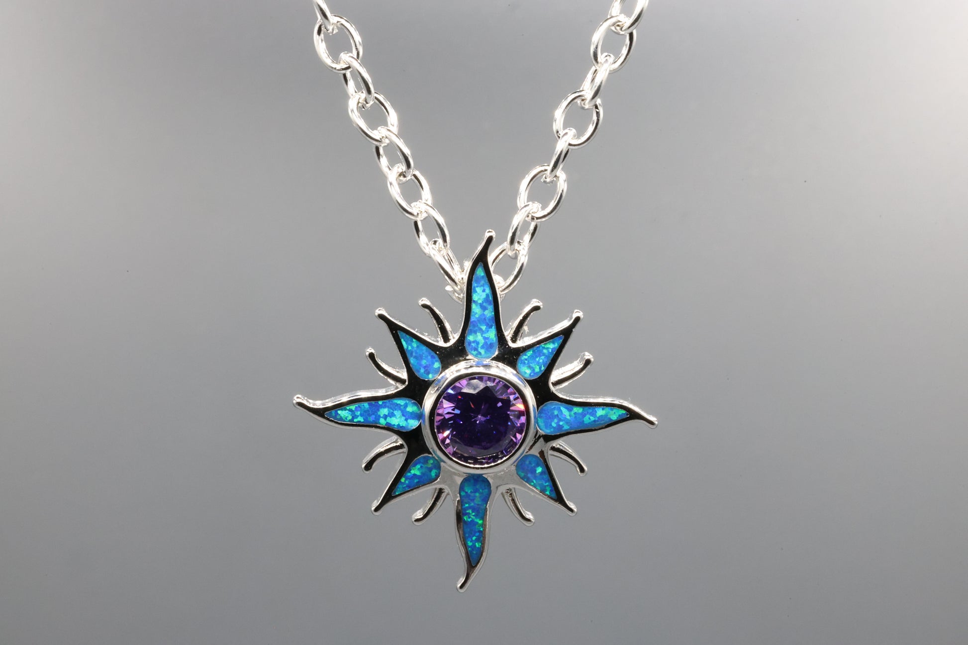 A burst of starlight frozen in time, Cosmic Starburst channels the mystery of the night sky and the shimmer of distant galaxies. Its dazzling pendant features a central purple gemstone—like a captured nebula—surrounded by radiant rays of opalescent blue and midnight black. Suspended from a silver-plated chain adjustable from 12 to 16 inches, this necklace is a tribute to cosmic wonder, intuition, and the magic of the unknown.
