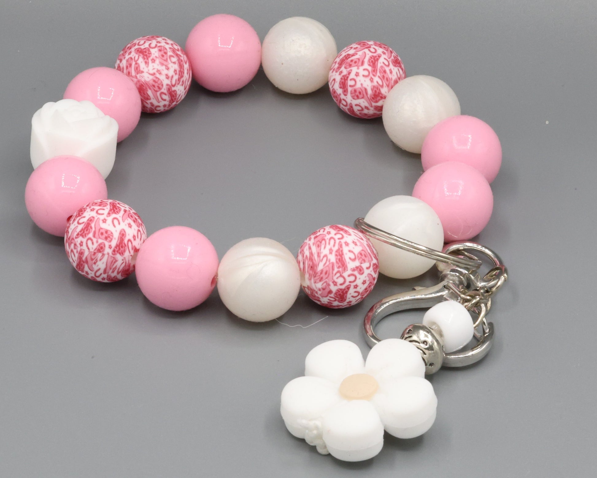 Cowgirl Bloom brings a little prairie sass to your everyday essentials. Featuring pink and white silicone beads—some adorned with cowboy boots and horseshoes—this bracelet-style keychain is finished with a delicate flower charm for a touch of feminine flair. A fun, functional piece for the wild-at-heart and flower-loving cowgirls alike