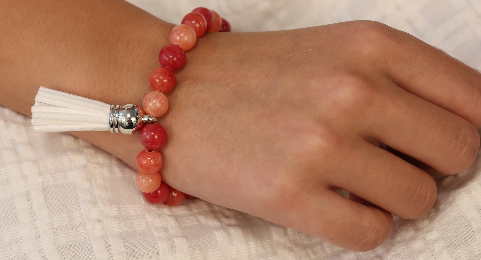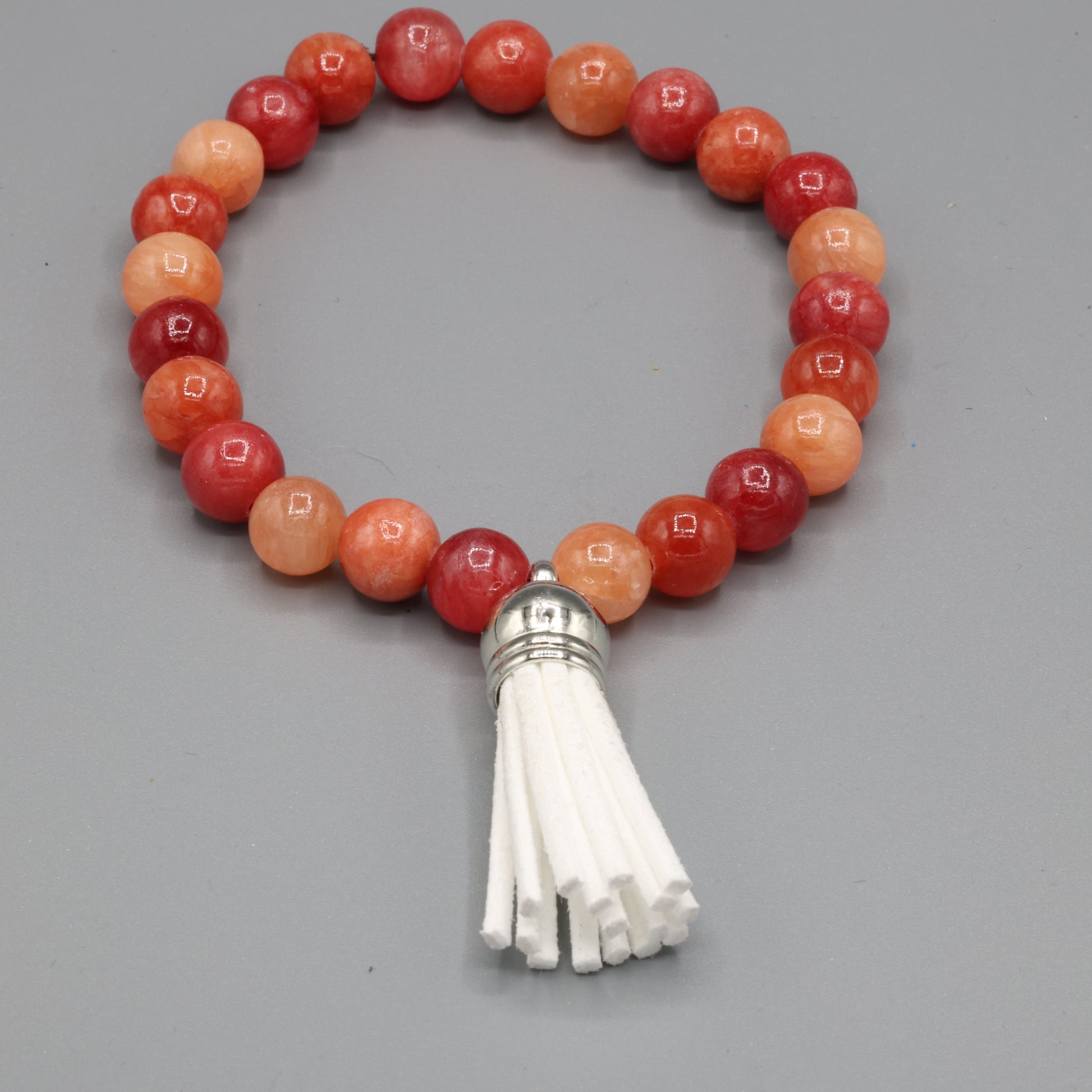 A bracelet born of fire and intention. Smooth carnelian beads in shades of ember, clay, and sunlit orange encircle the wrist like a quiet blaze—each one a spark of courage, vitality, and creative force. Anchored by a soft white tassel, this piece evokes balance: heat and hush, motion and stillness. Wear it as a talisman for bold beginnings, or simply to carry warmth wherever you go.