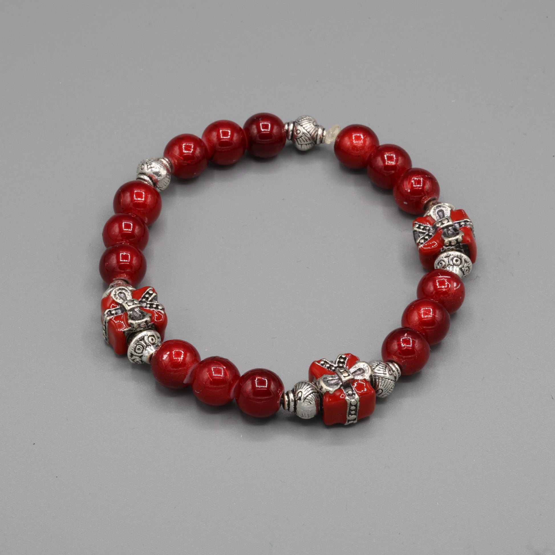 Bold and radiant, this bracelet pairs glossy red beads with silver-toned gift-shaped accents, creating a piece that feels both festive and timeless. The rich crimson tones evoke passion and vitality, while the ornate silver details add a touch of ceremonial charm. Whether worn as a symbol of love, celebration, or personal strength, this bracelet is a keepsake of warmth and intention.