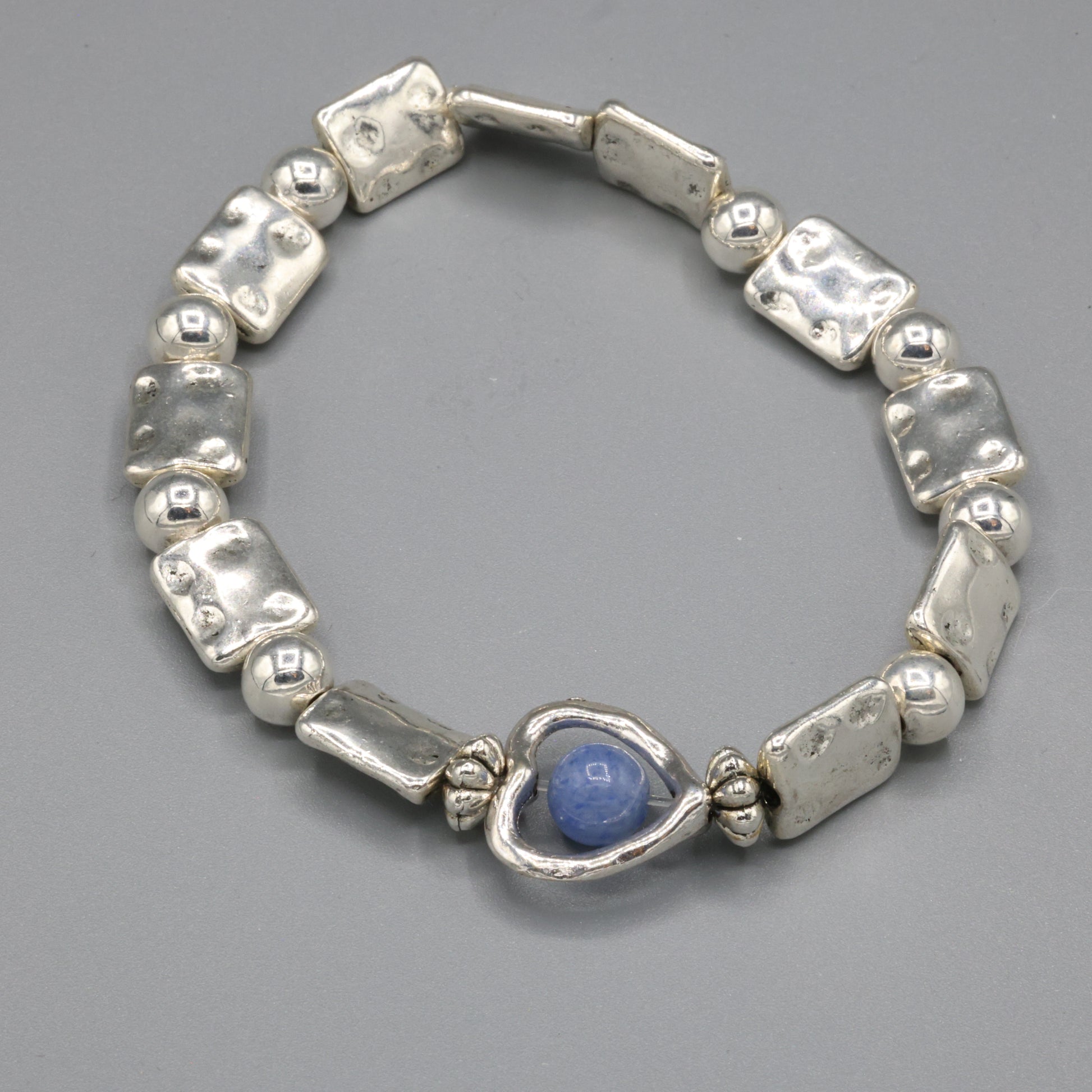 A quiet pulse of serenity and strength—this bracelet features silver-plated beads and a heart-shaped setting cradling a radiant blue agate. Known for its calming energy and protective qualities, the agate glows like a hidden tide. A piece for those who carry love like water: deep, clear, and unwavering.