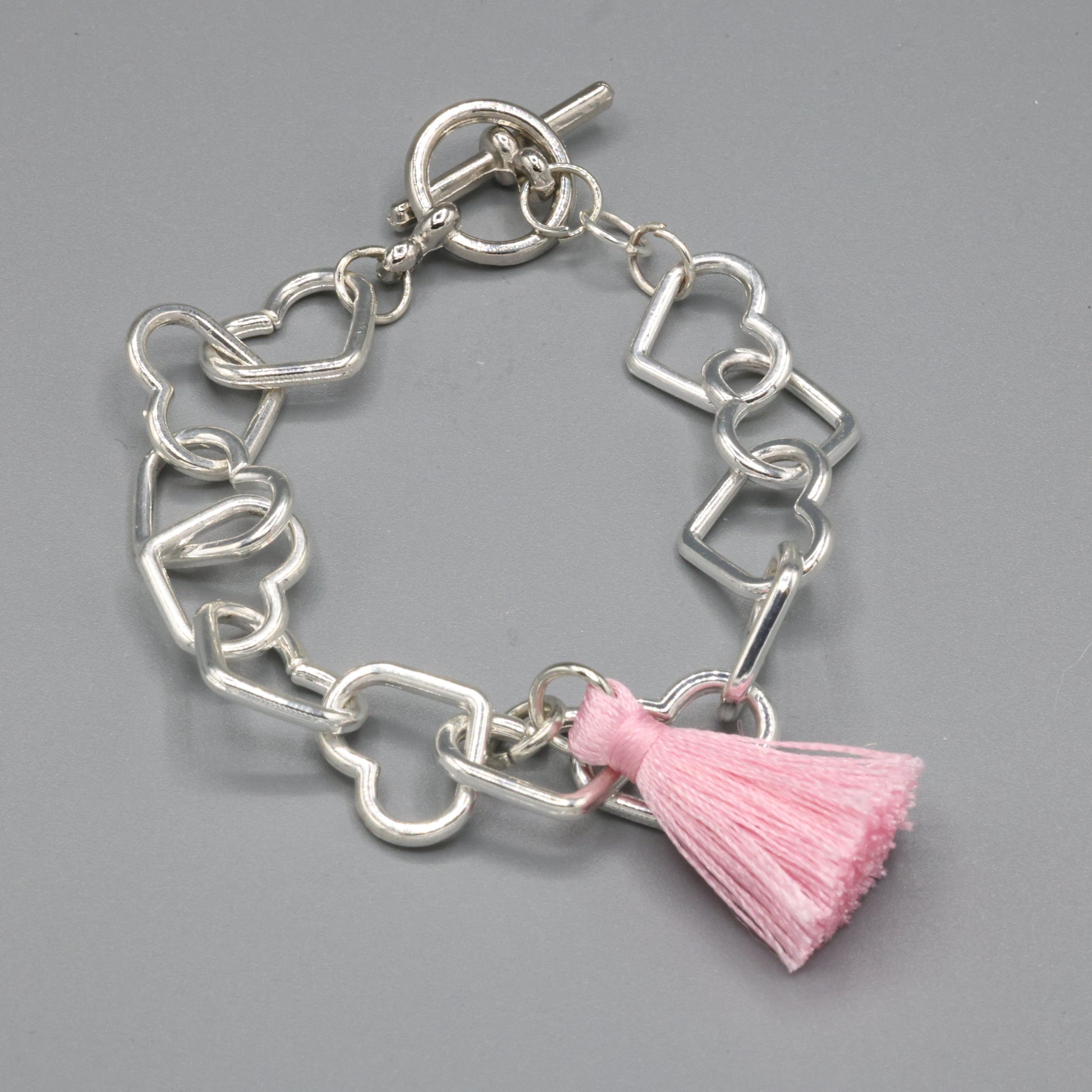 A path of love, light, and gentle color. This bracelet features silver-plated heart links that shimmer with movement, finished with a soft pink tassel that adds a touch of whimsy. A piece that speaks of affection, grace, and the joy of quiet connection.