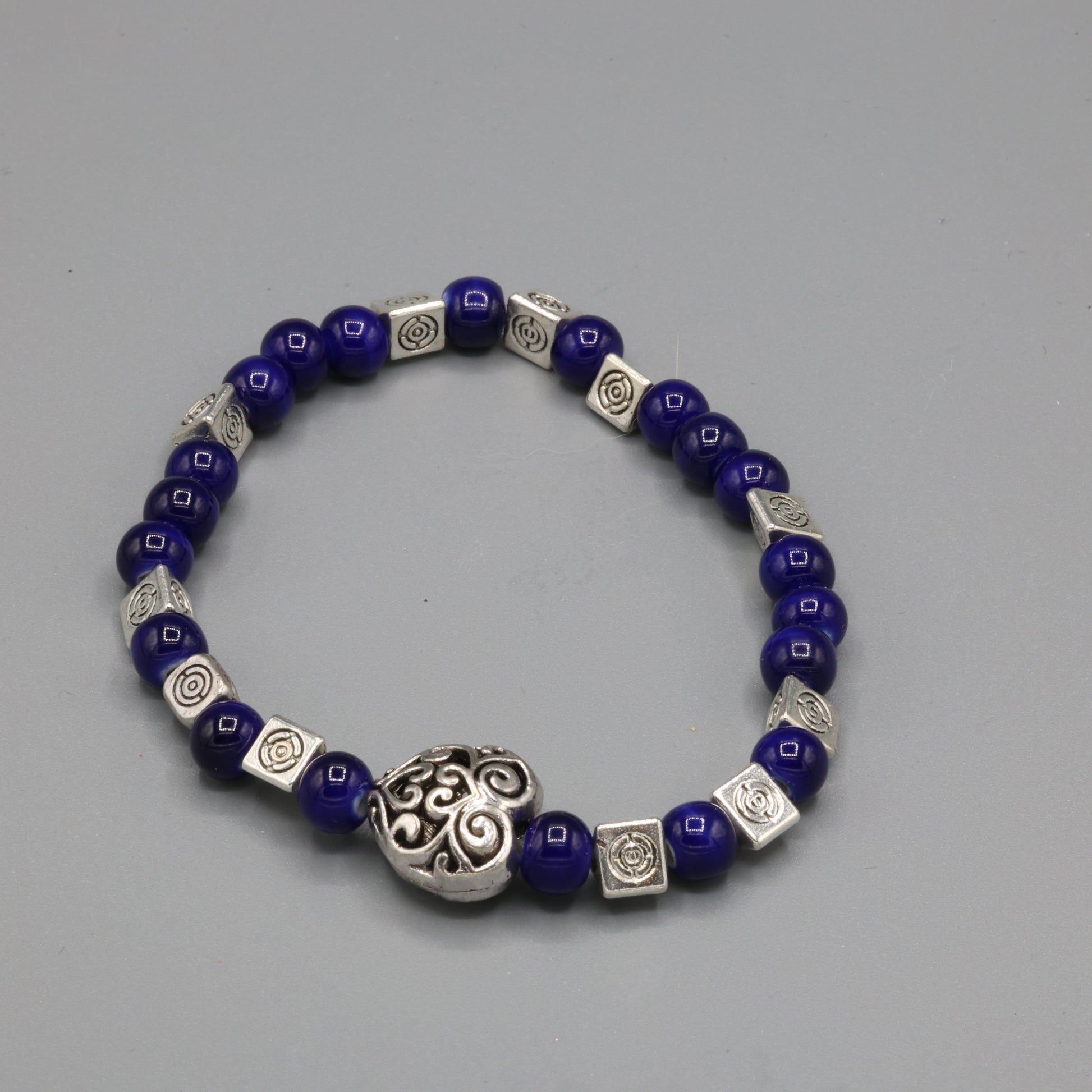 A quiet devotion wrapped in twilight tones. This bracelet features deep blue beads paired with silver-plated charm accents and a delicate heart centerpiece. A piece that speaks of love held close—steady, luminous, and serene.