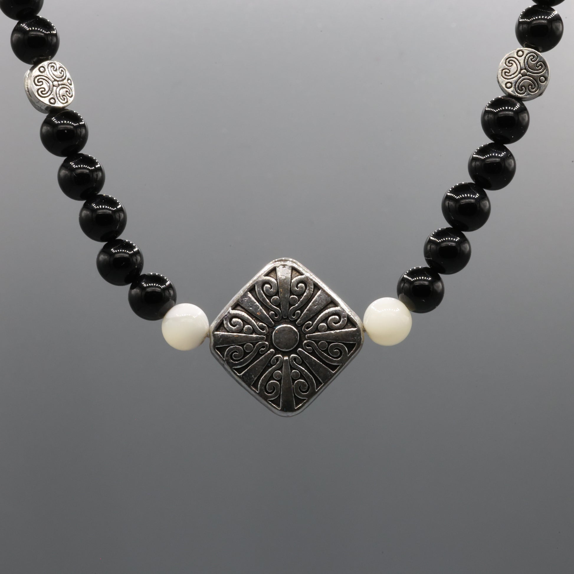 A quiet bloom in the heart of night—this necklace pairs the grounding energy of 4mm black jasper with the luminous grace of mother of pearl. Centered by a hand-engraved floral pendant, each bead is placed in perfect symmetry, echoing balance and inner stillness. This piece is a tribute to resilience, intuition, and the beauty that flourishes in darkness. Measuring from 17 - 22 inches.