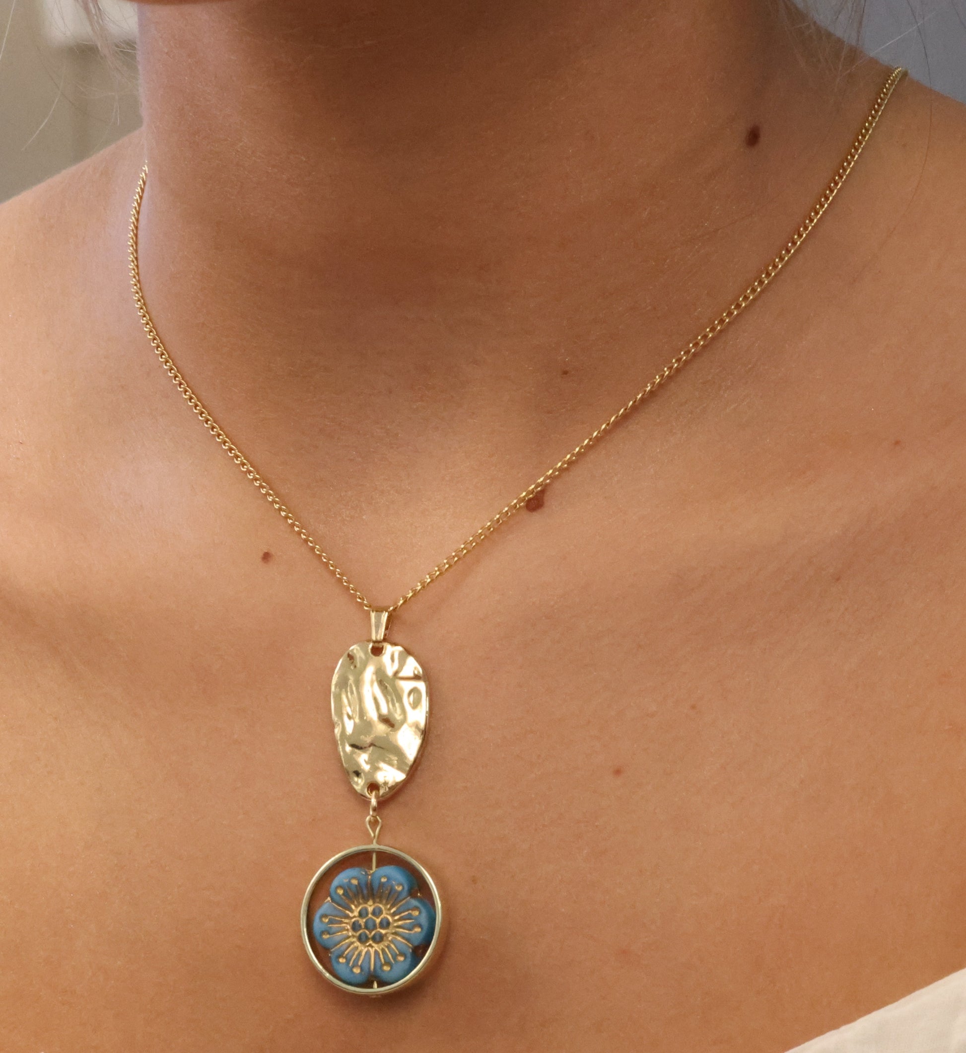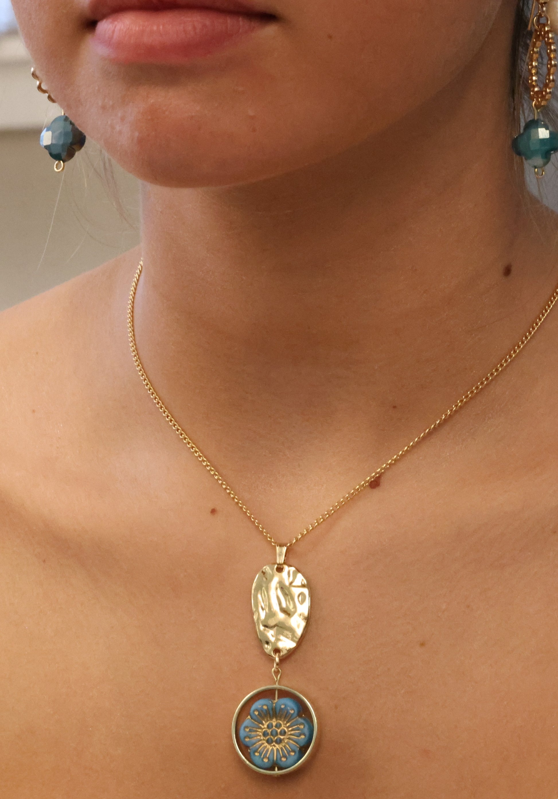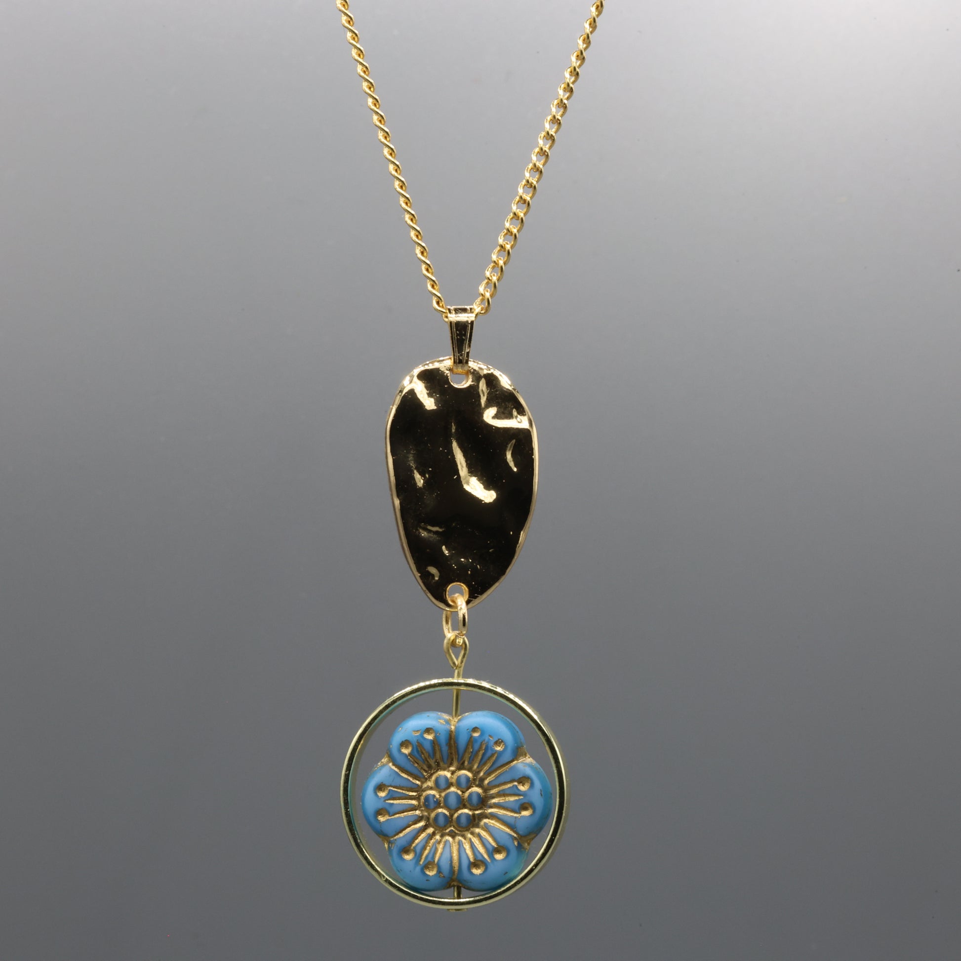A radiant ode to the sun’s quiet power, capturing the moment when light meets bloom. Suspended from a golden chain, this pendant pairs textured metal with a luminous Czech glass flower—its deep blue petals encircled by a sun-kissed halo.