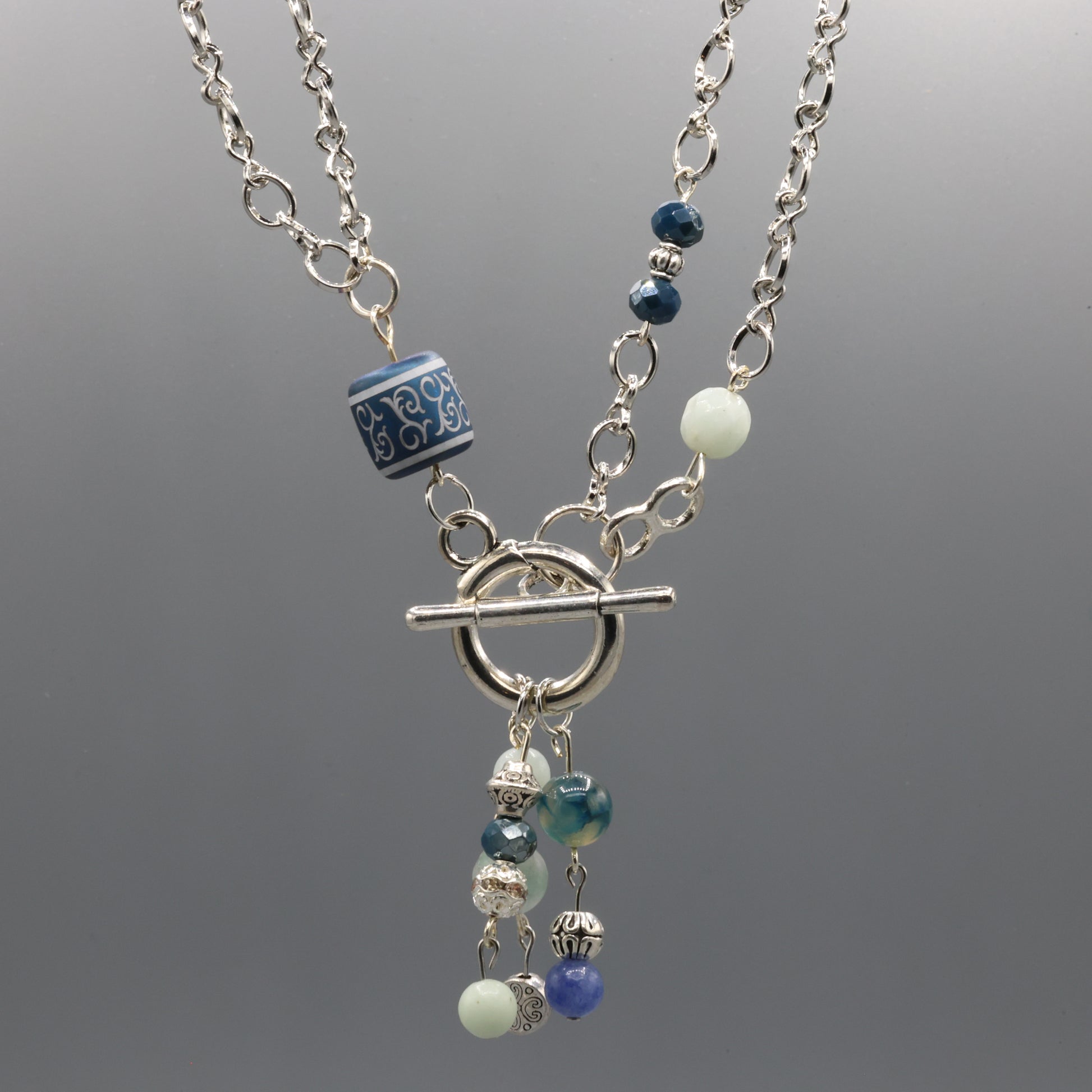 A glimmer caught between stone and sky—blends the mystique of dragon vein with the sparkle of faceted beads and a single blue glass accent like a drop of twilight. Suspended from a silver-plated chain with an adjustable toggle clasp (20 - 40 inches in length), this necklace evokes movement, mystery, and quiet radiance.