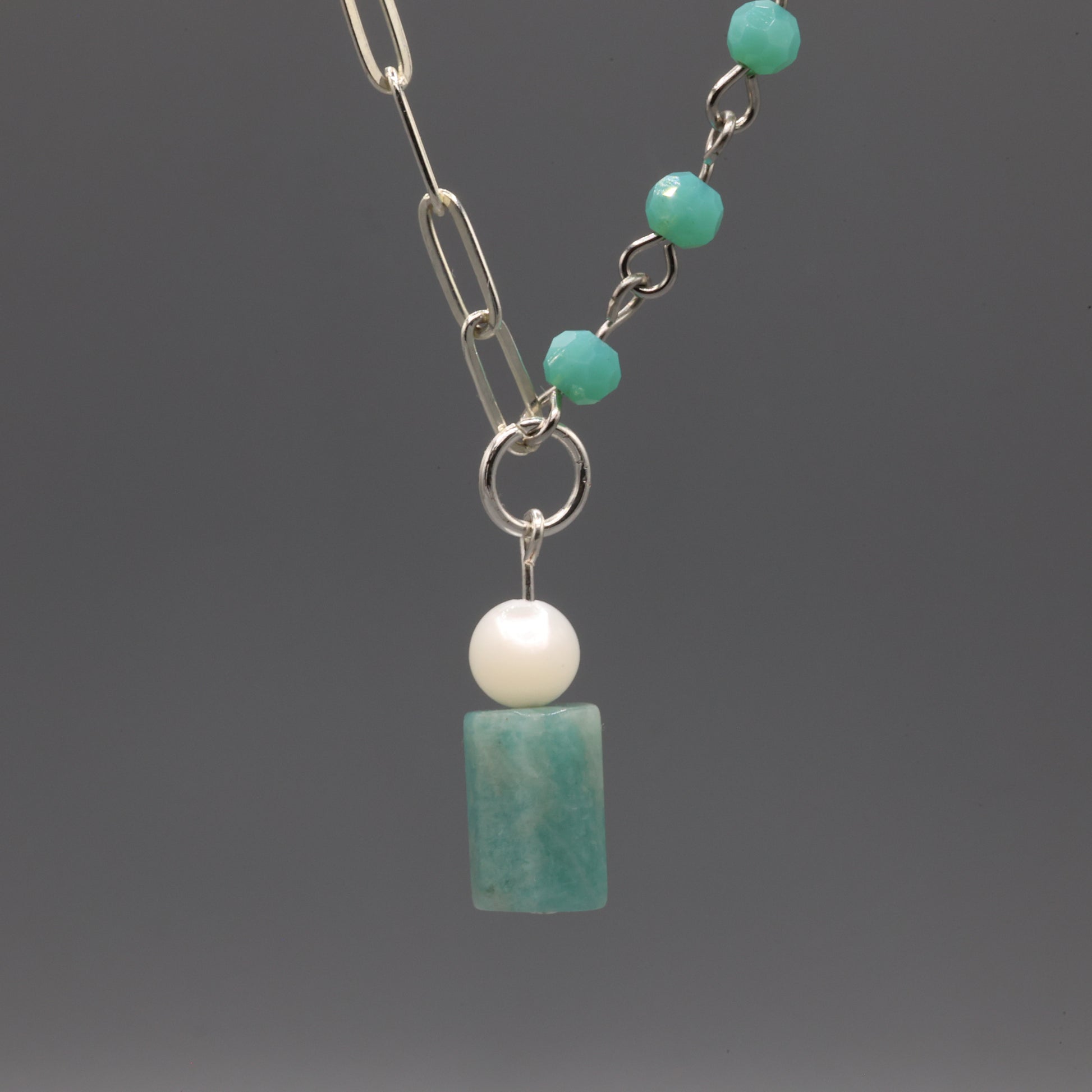 A breath of serenity in motion—pairs a half silver-plated chain with faceted teal beads that shimmer like sunlit water. Suspended from a circular charm are a smooth amazonite tube and a luminous mother-of-pearl bead, adding depth and grace to the design. Measuring 12.5 inches with charm and 11.5 inches without, this necklace offers a tranquil balance of texture and tone. Paired with Starlace Crescent in the photo (each necklace sold separately).