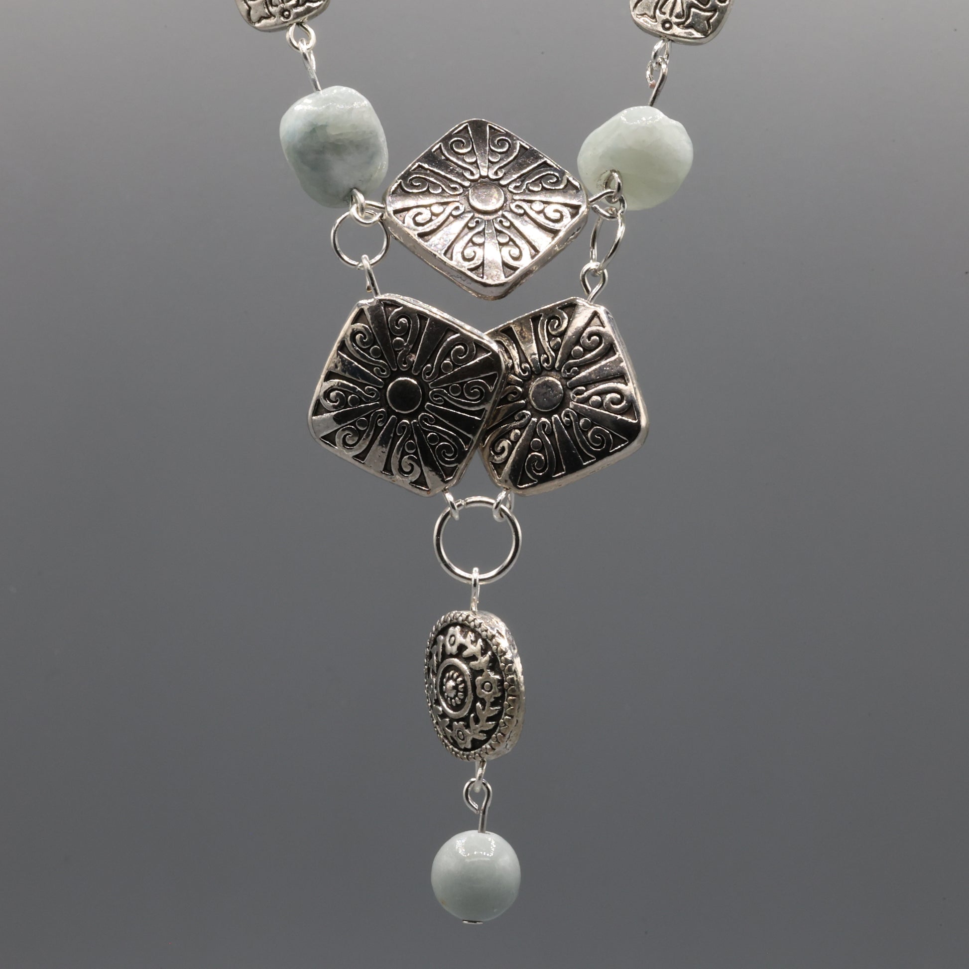 A gentle flow of silver and teal channels serenity and subtle strength. This 19-inch necklace features silver-plated beads paired with dyed teal quartz—a stone of emotional clarity and calm.