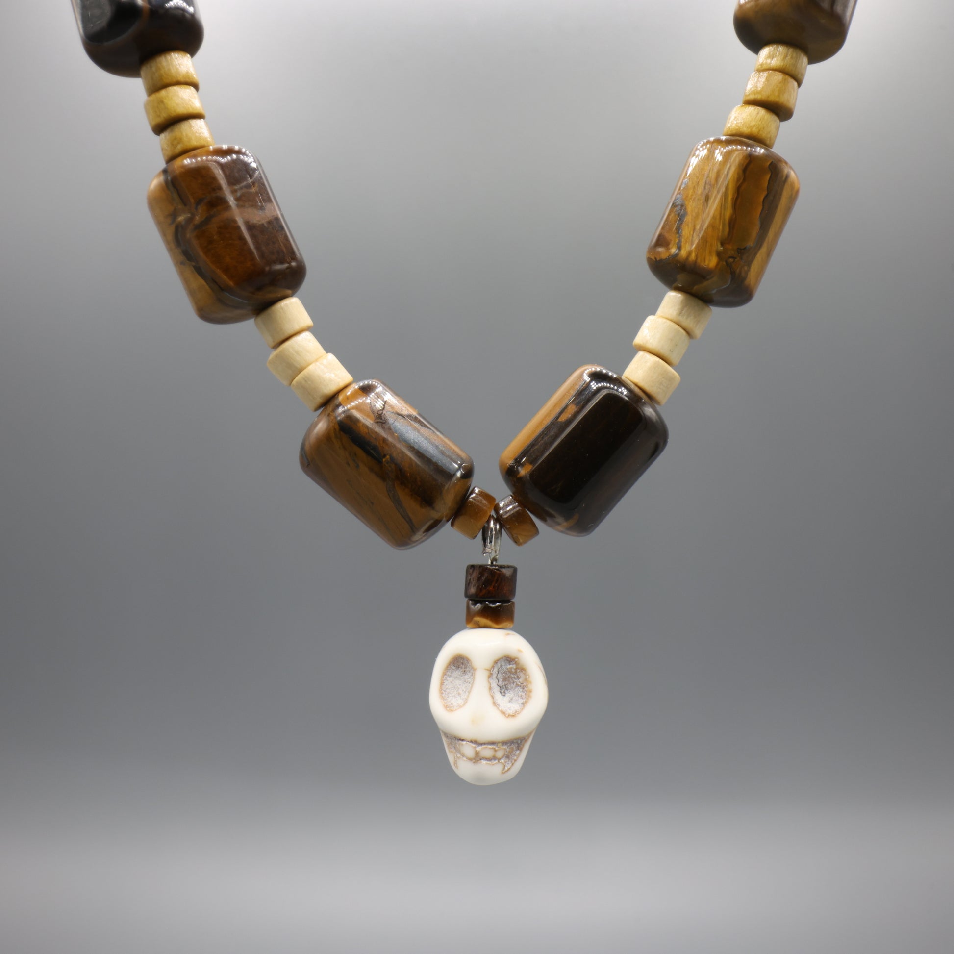 Earthborn and fierce, this piece is a 16–20 inch necklace crafted from warm wood and tiger eye cylinder beads—stones of grounding, clarity, and quiet strength. At its center rests a carved skull, a symbol of transformation and ancestral wisdom. This piece channels primal energy and rooted resilience, perfect for those who walk with intention and spirit.