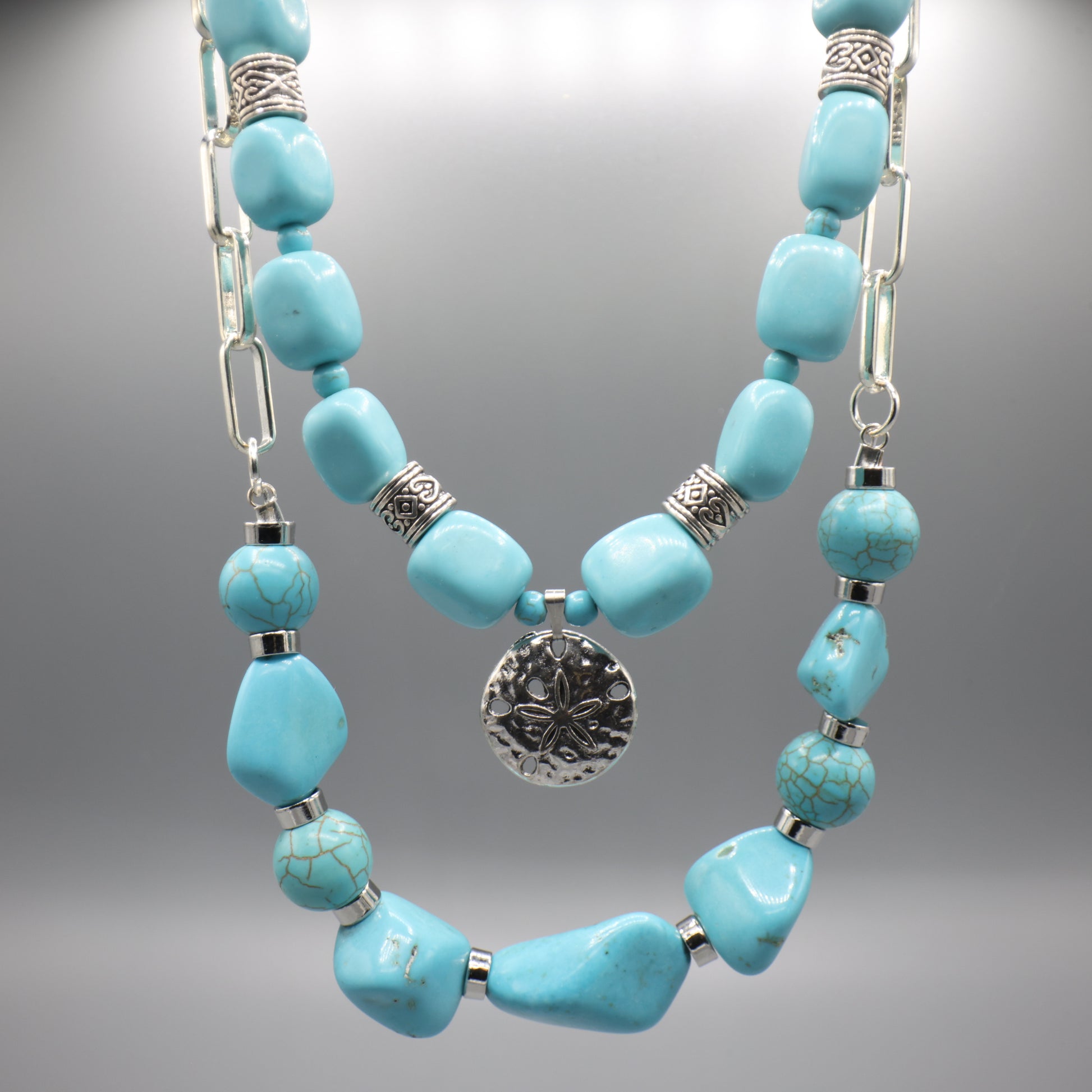 Flowing with earthy elegance, this piece is a 20-inch necklace crafted from howlite turquoise—stone of tranquility and truth—paired with a silver-plated sand dollar charm. The organic shapes and ocean-inspired textures evoke the rhythm of waves and the grounding calm of coastal wanderings. A soulful piece for those who carry the sea in their spirit and serenity in their stride. Consider layering with a longer turquoise necklace (each necklace sold separately).