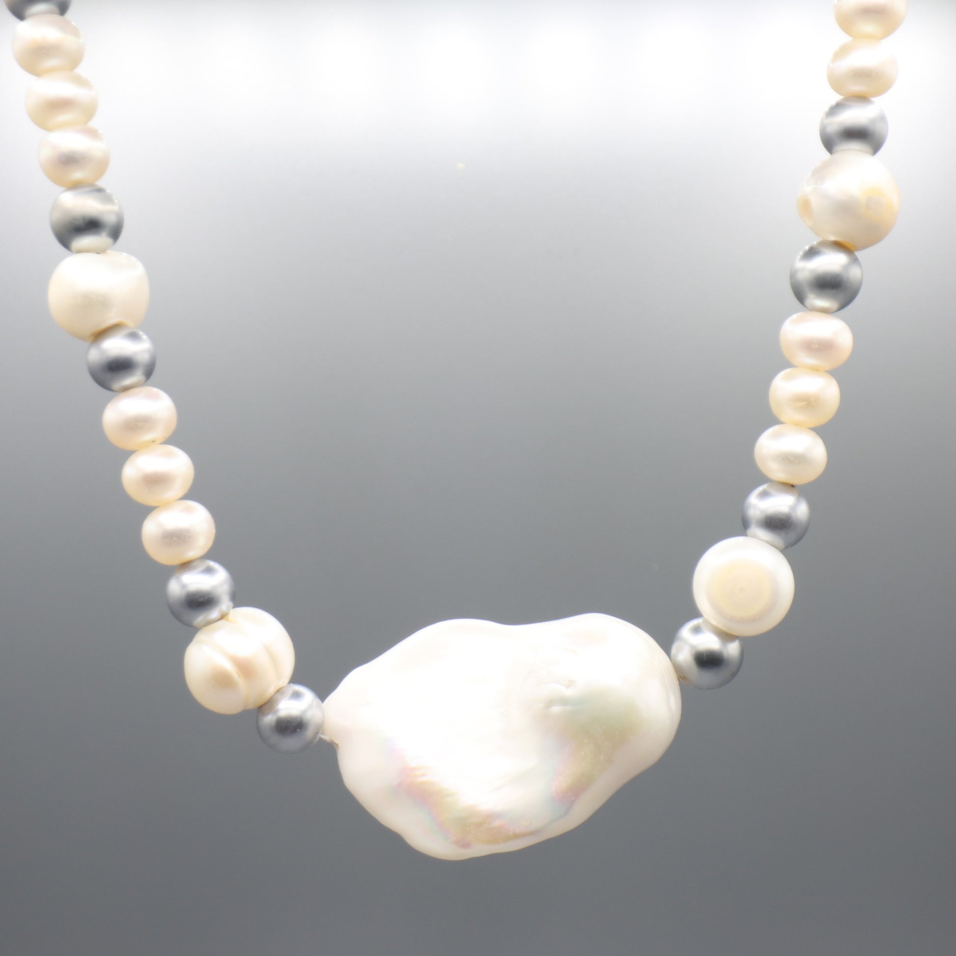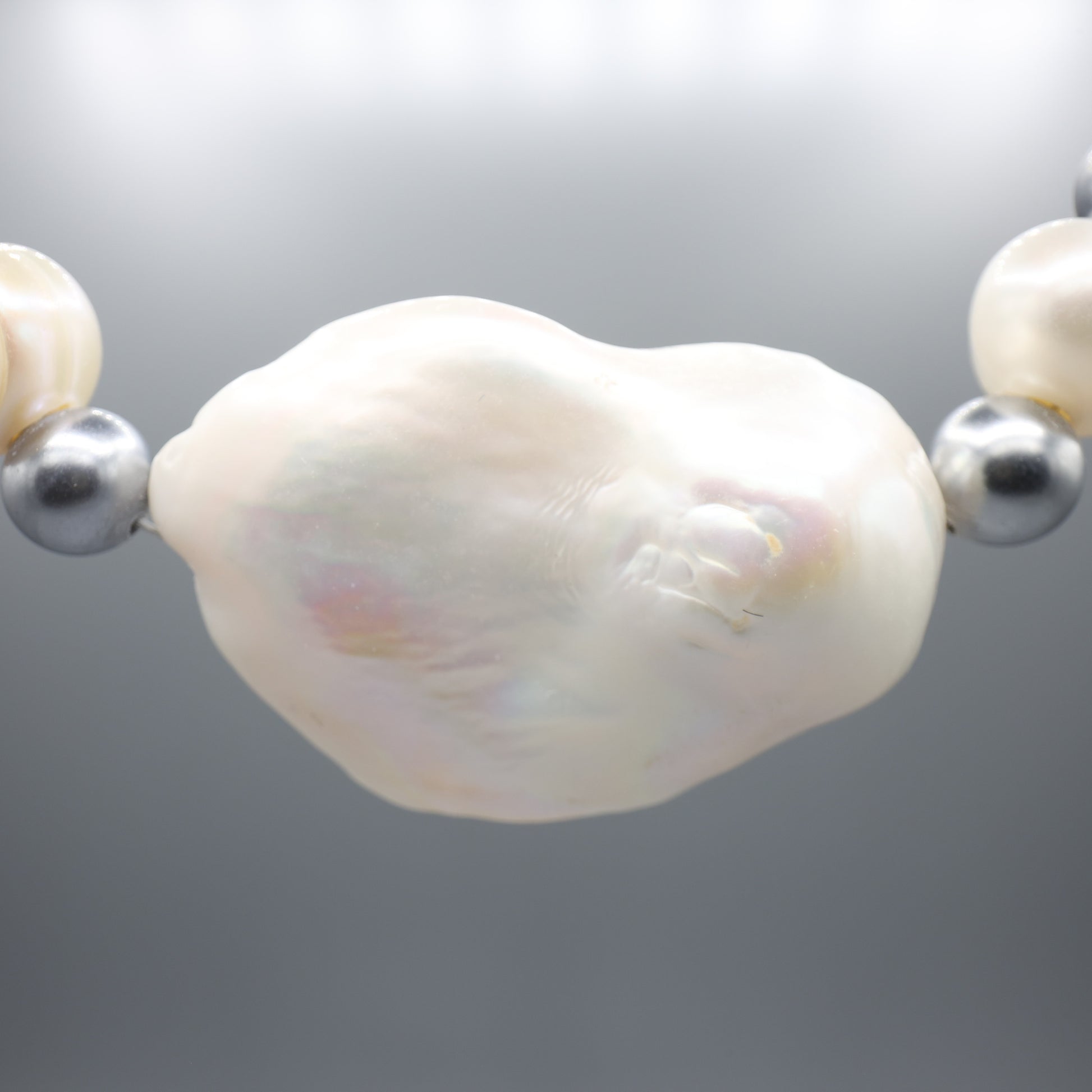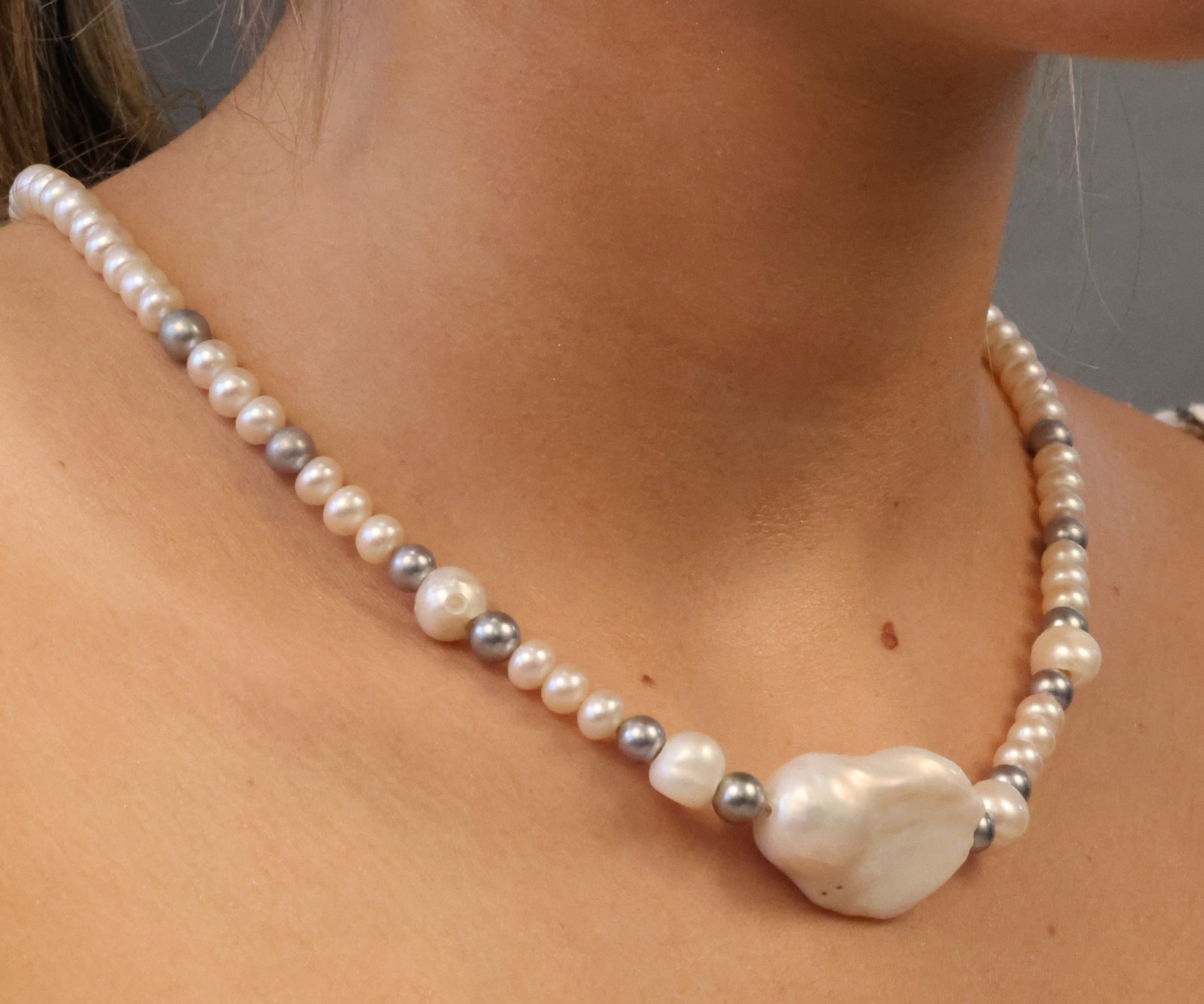 Elegant and organic, this piece is a 17.5–19.5 inch necklace crafted from 8 and 10 mm freshwater pearls, anchored by a luminous 30 mm centerpiece. Each pearl carries the hush of ocean tides, while the bold central pearl echoes nature’s quiet strength. A timeless piece that speaks in soft shimmer and soulful grace—perfect for those who listen to the language of the sea.