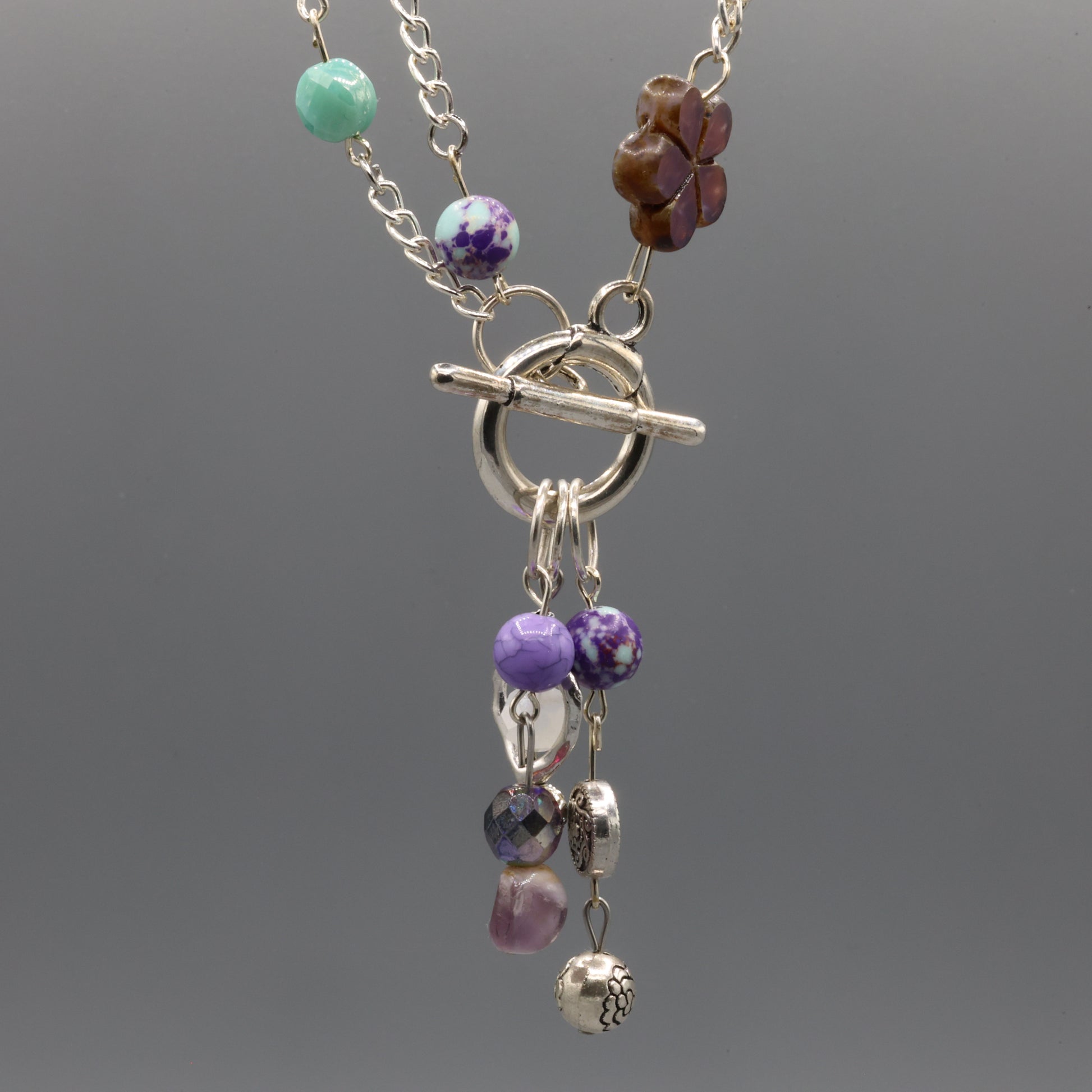 A bloom in motion, featuring a silver-tone chain adorned with a Czech glass flower and a vibrant mix of beads in playful hues. The adjustable toggle clasp (12 - 21.5 inches) allows for versatile styling, while the layered textures evoke joy, creativity, and a touch of floral magic.