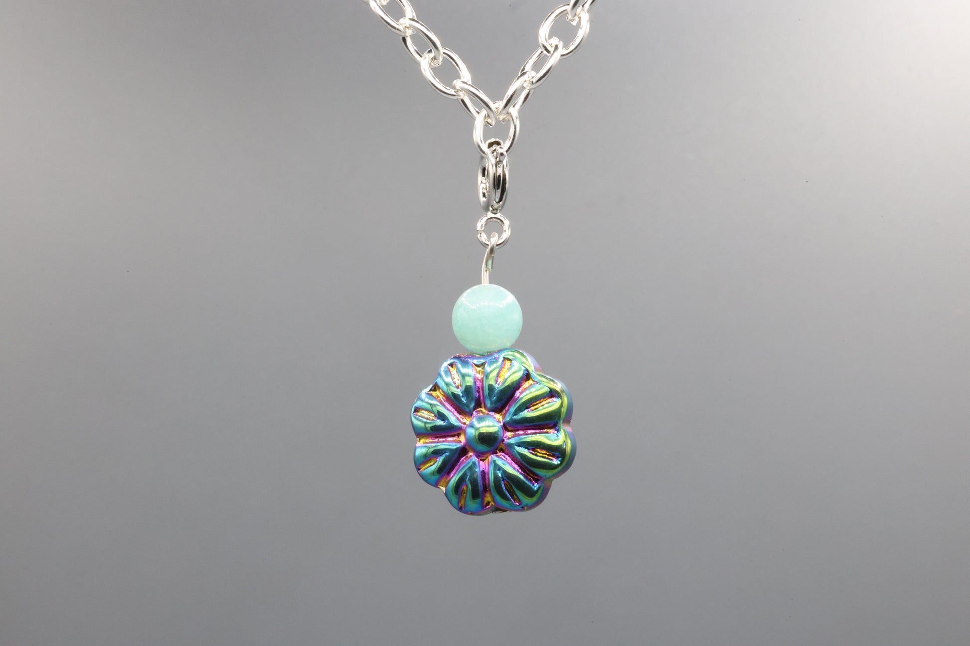 Step into a magical meadow where fireflies glow and flowers sparkle! This necklace has a shiny flower that changes colors—green, purple, and blue—just like a rainbow in the grass. Above it hangs a soft blue bead that adds a gentle touch of sky. The silver chain can be made longer or shorter (12 to 16 inches), so it fits just right. Mystic Meadow is perfect for kids who love fairytales, nature, and a little sparkle in their day.