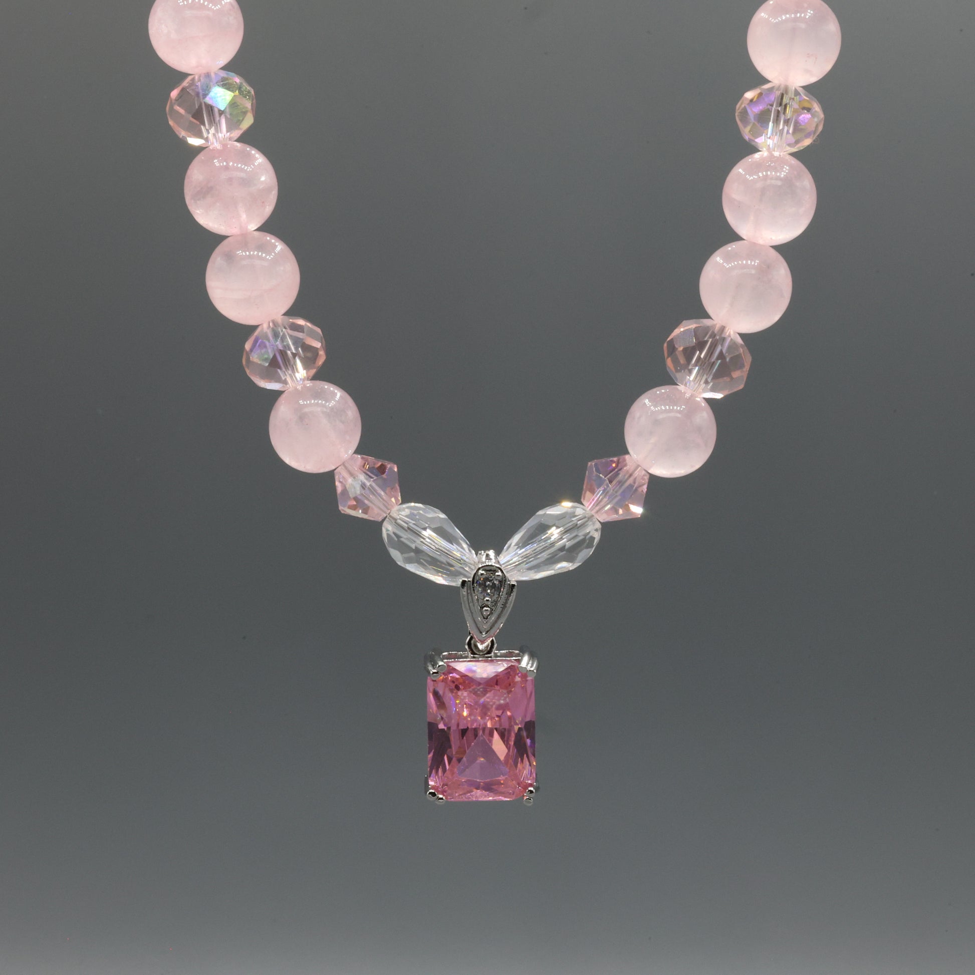 A one-of-a-kind creation that glows with soft sophistication. Pink Ice features a delicate blend of pink ice and pink quartz beads, each chosen for their gentle shimmer and calming energy. At its center, a rectangular-cut pink sapphire CZ pendant sparkles in a sterling silver-plated setting—adding a bold touch of brilliance to this graceful piece. Feminine, fresh, and full of light, this necklace is perfect for those who love elegance with a hint of sparkle.