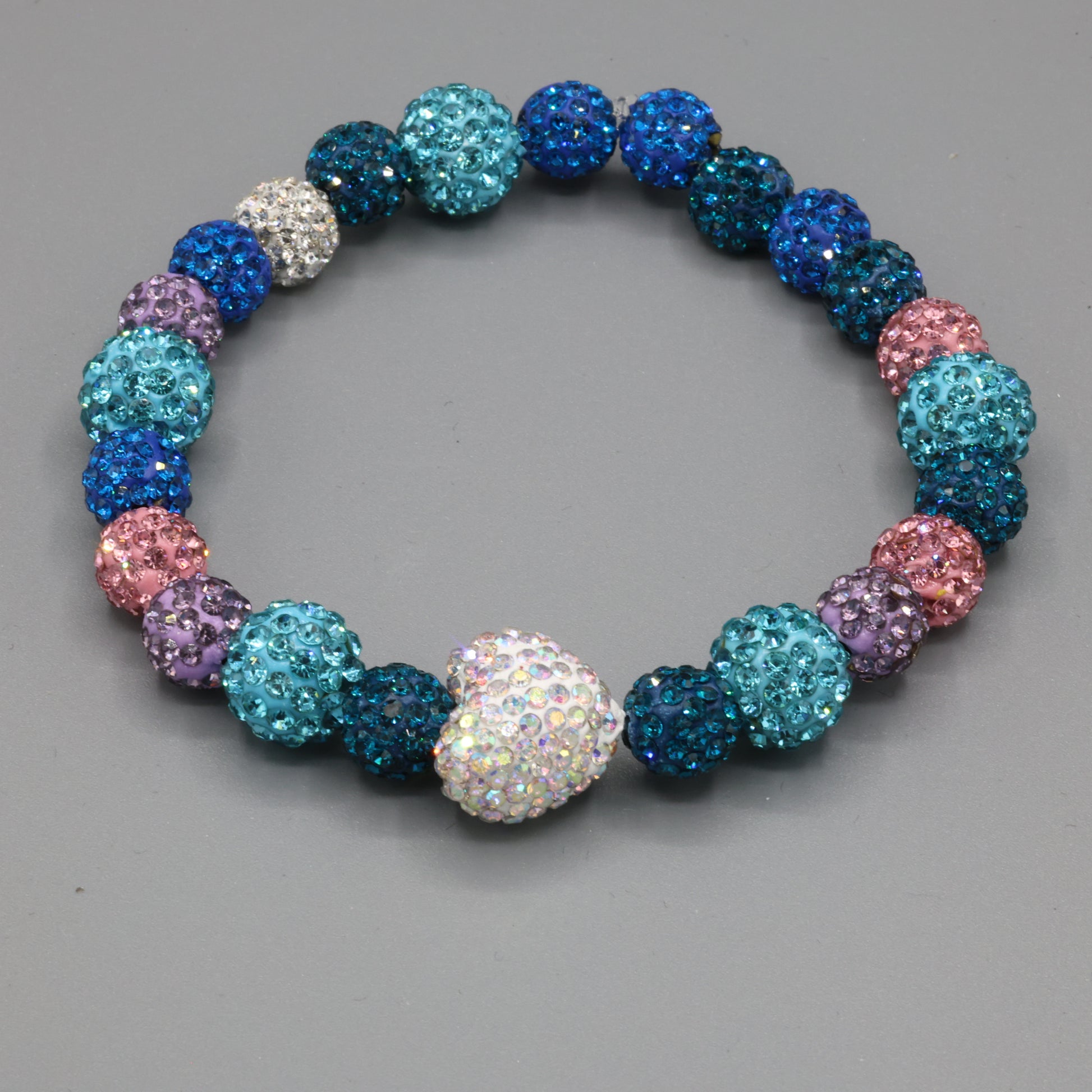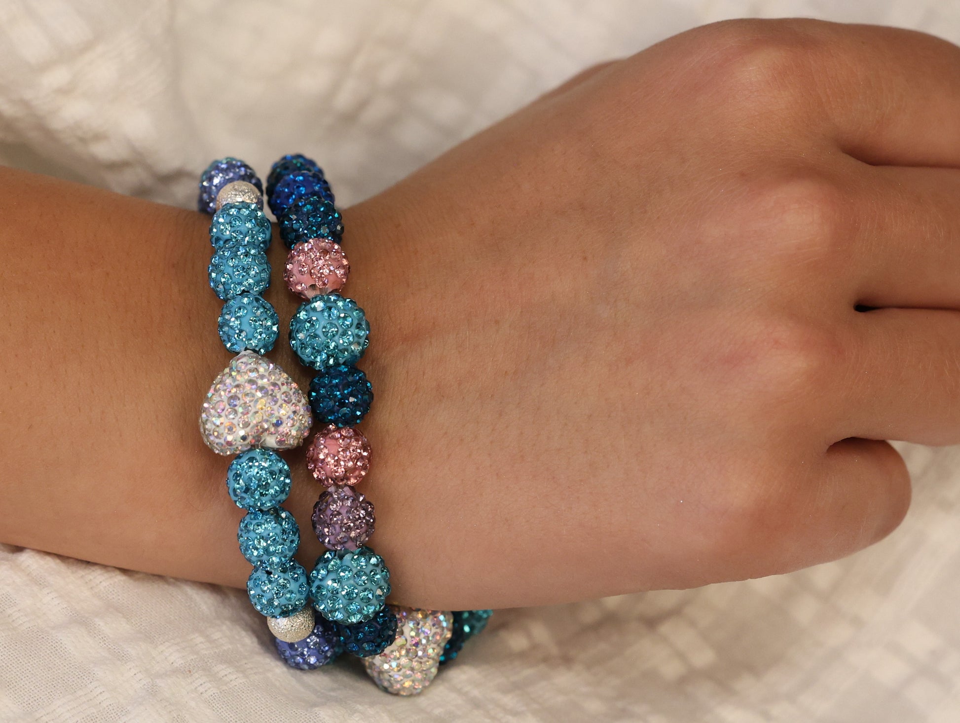 A celebration of sparkle in every shade. This bracelet features glittering beads in hues of blue, pink, purple, teal, and white—ranging from 6 to 10 mm for a playful, dimensional look. A luminous centerpiece adds a touch of radiance, making this piece a joyful expression of color, light, and grace. Consider pairing with Shimmering Heart (each bracelet sold separately).