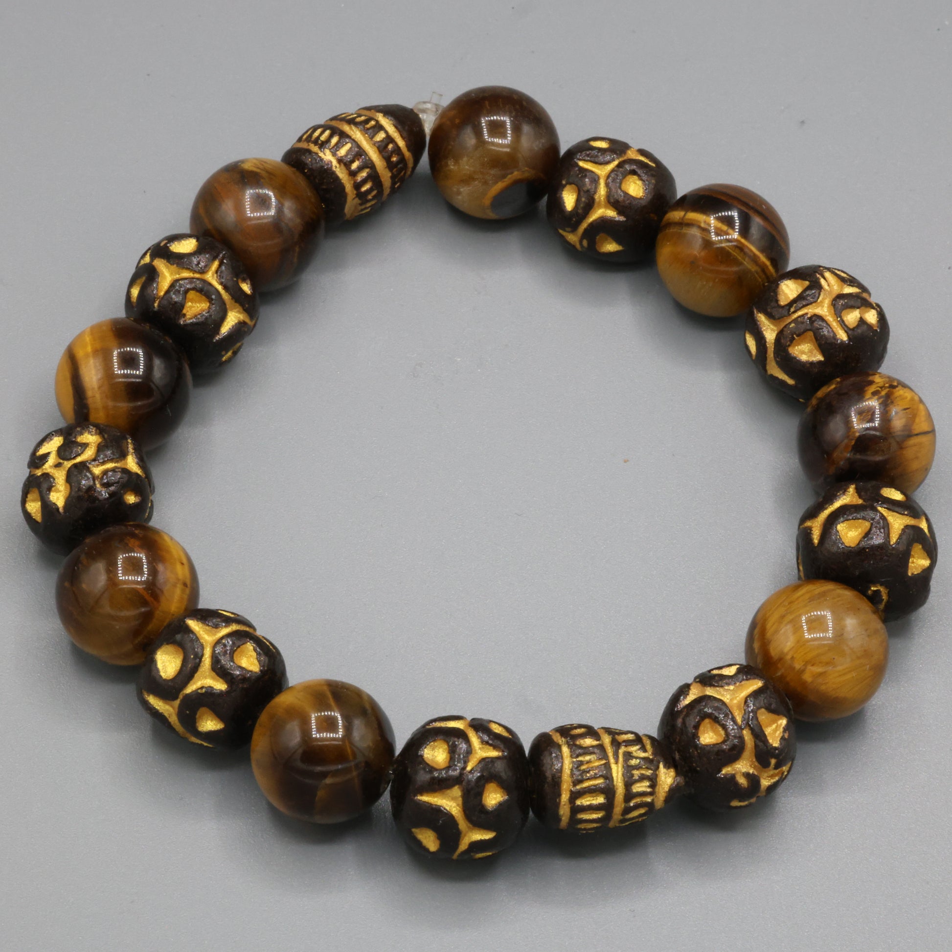 Description: A guardian of grounded light, pairs the fierce clarity of tiger eye with golden-carved wood beads that echo ancient symbols and forest lore. Each bead glows with protective energy, anchoring intuition and courage in a warm, earthy embrace.
