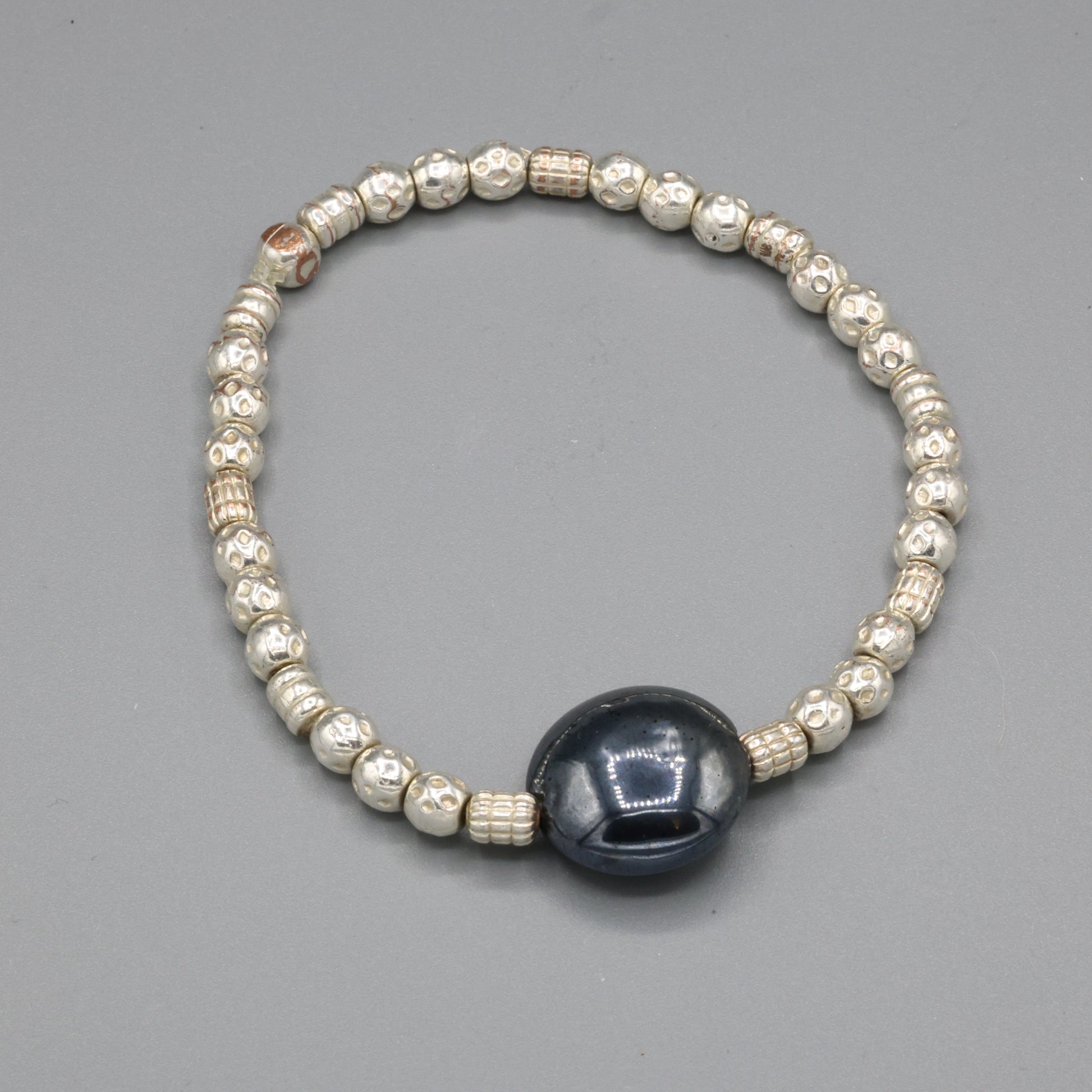 A quiet shimmer with a grounded heart. This bracelet features silver-tone beads that catch the light with subtle grace, centered around a single polished stone that radiates quiet strength. A piece that speaks of clarity, balance, and inner stillness.