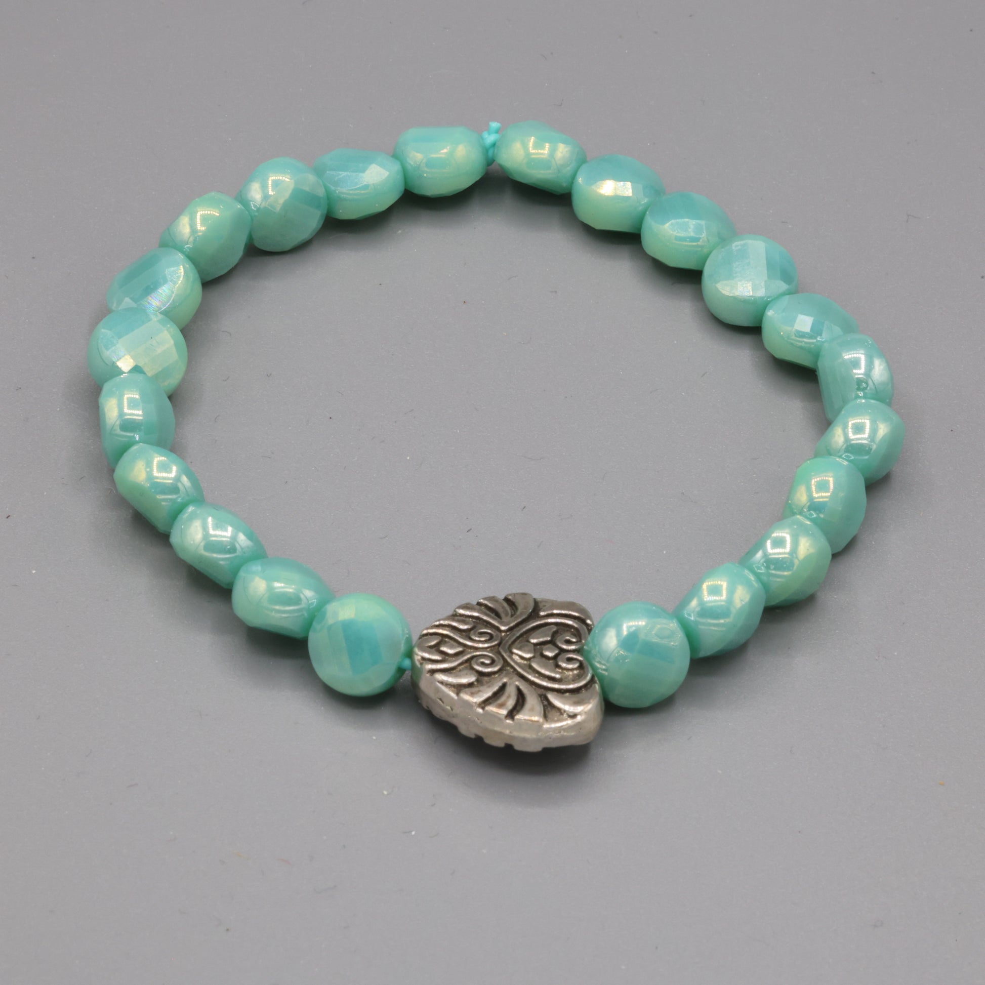 A bracelet that carries the calm of ocean tides and the quiet strength of love. Irregular teal beads shimmer like sunlit waves, each one unique in its shape and hue. At the center, a silver-toned heart rests—simple, radiant, and grounding. This piece evokes emotional clarity and connection, perfect for those who walk with grace and speak from the soul.