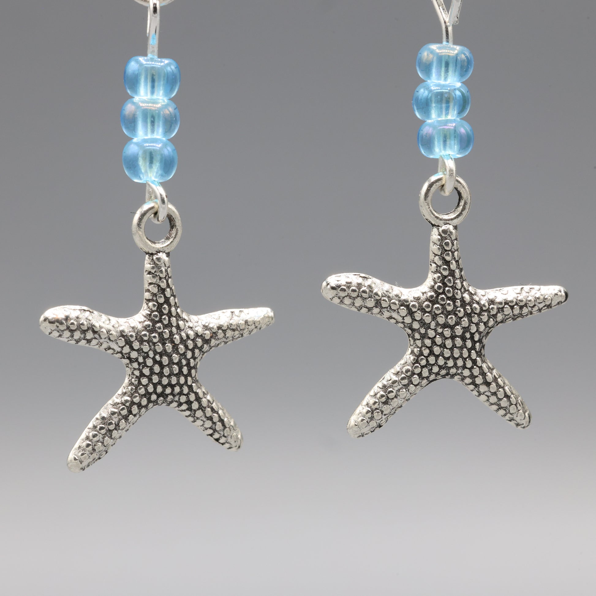 A shimmer from the sea’s edge. These earrings feature Czech seed beads and silver-plated hoops adorned with starfish charms, capturing the quiet magic of ocean light.