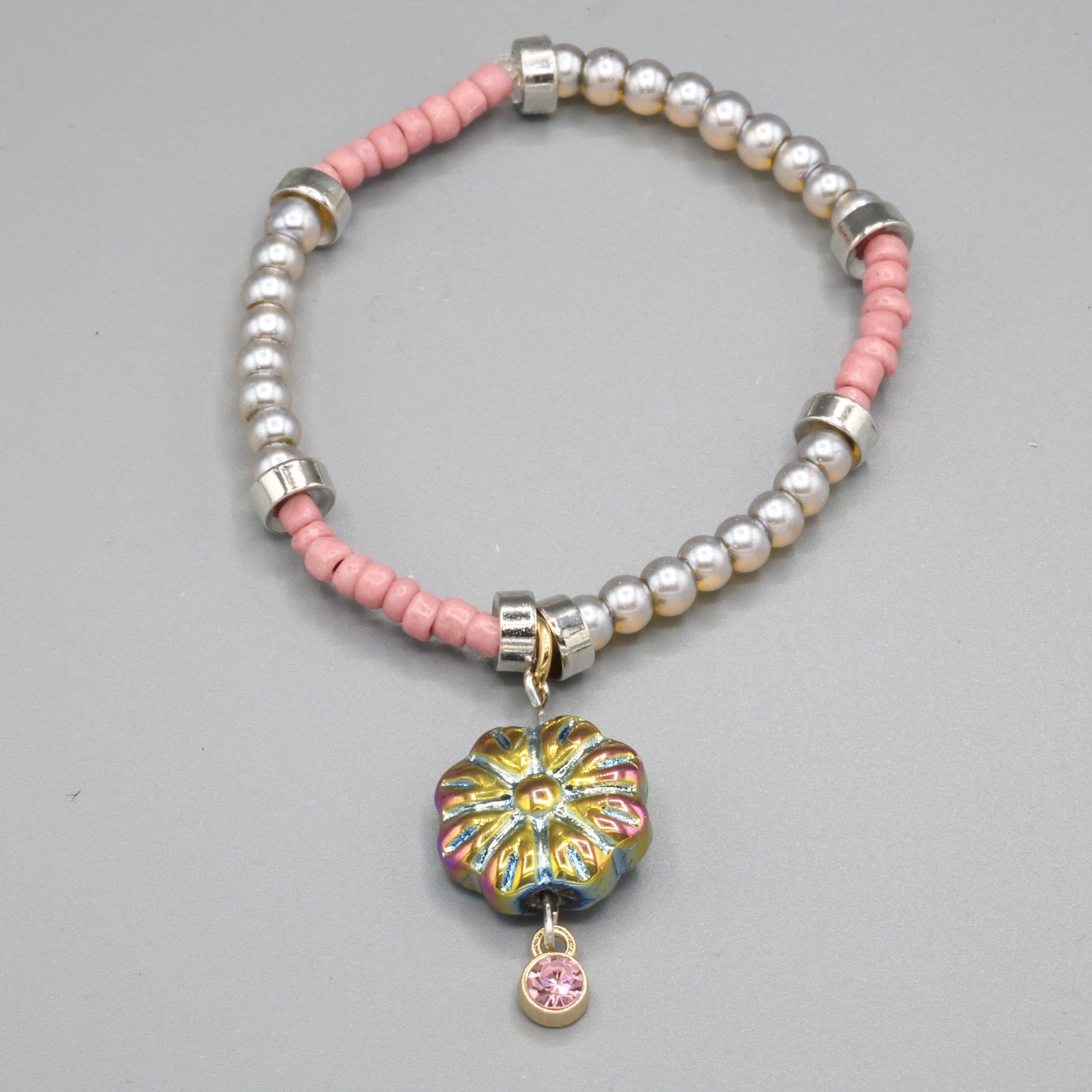 A swirl of magic and shimmer, Unicorn Twirl pairs silvery tones with soft pink beads for a look that’s pure enchantment. A sparkly flower charm dances below, catching light like a fairy’s wink. Made for kids who believe in wonder, twirl through dreams, and sparkle wherever they go. Measure your wrist to determine your preferred size in inches (size 5 to 7 available for this product). Feel free to add a comment if you desire a different size.